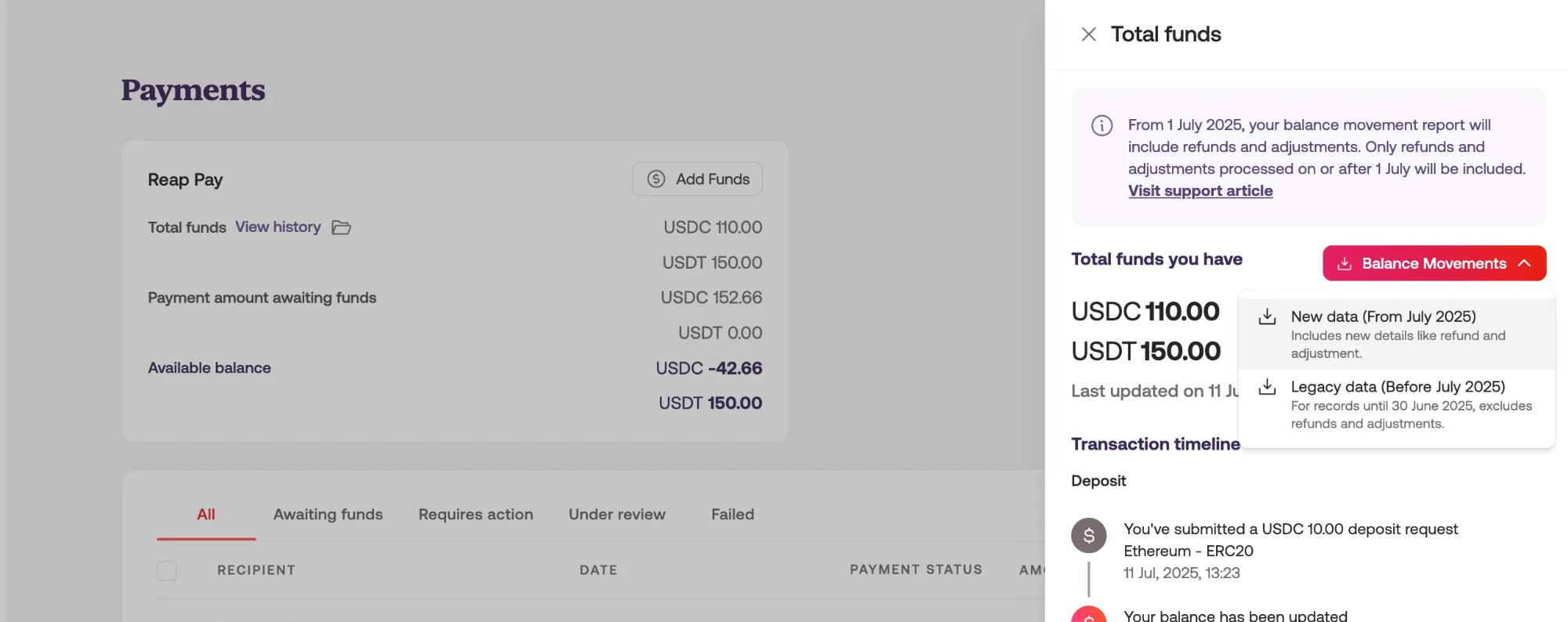 We’ve made an upgrade to how balance movements are tracked and exported in Reap Pay. This means you’ll now see more detailed and accurate data when you export your transaction history — including entries that were previously hidden, like refunds and manual adjustments.