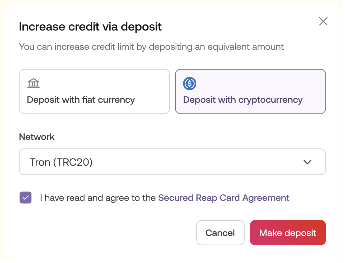You can increase your credit limit by sending digital currencies into your Reap account directly from your Reap dashboard.