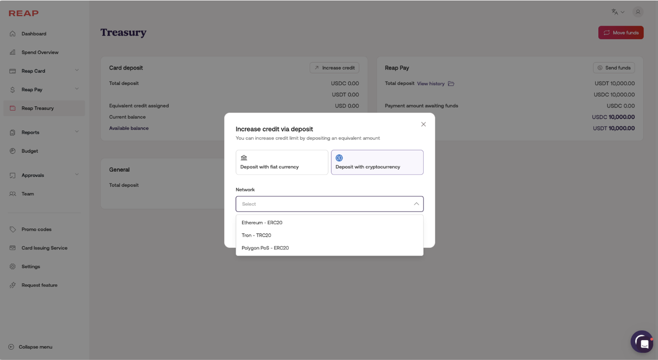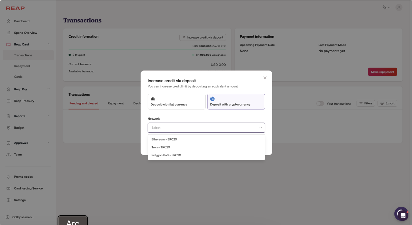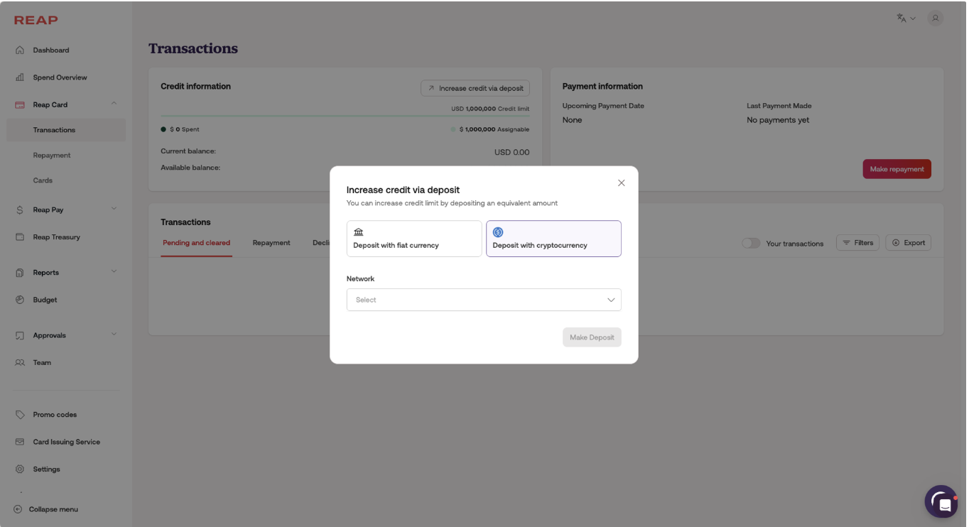 Visit Reap dashboard → Reap Card → Transactions page and click on the "Increase credit via deposit" button.