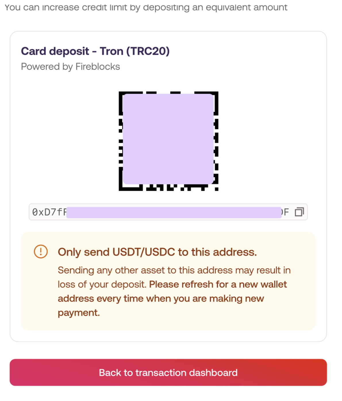 This flow allows for a quicker reconciliation (within few minutes) for digital currencies funding for you to start spending on your card as soon as you have sent the fund!