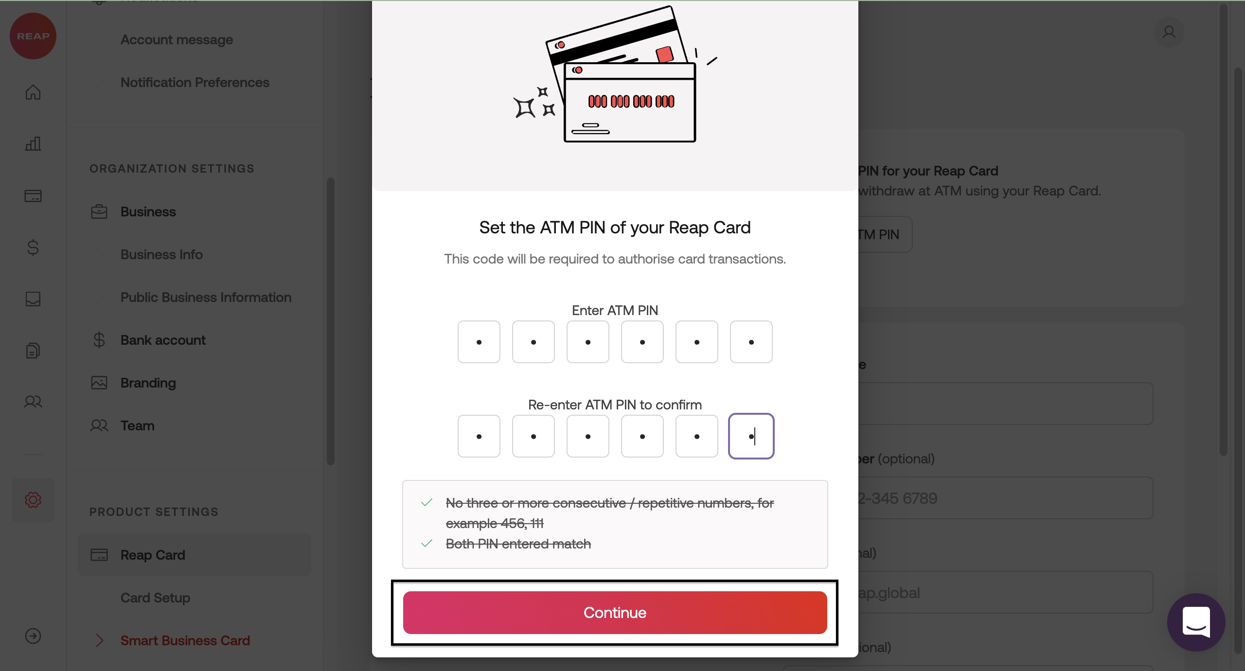 Step 4: Enter your desired 6-digit ATM PIN, and then click Continue to proceed.