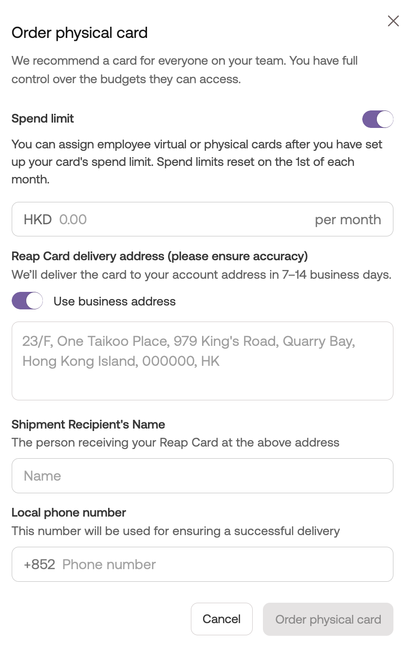 Step 3: In the pop-up window, you can set a spend limit for the user's physical card, as well as the Delivery address, Shipment Recipient’s Name, and Local Phone Number of the card shipment.