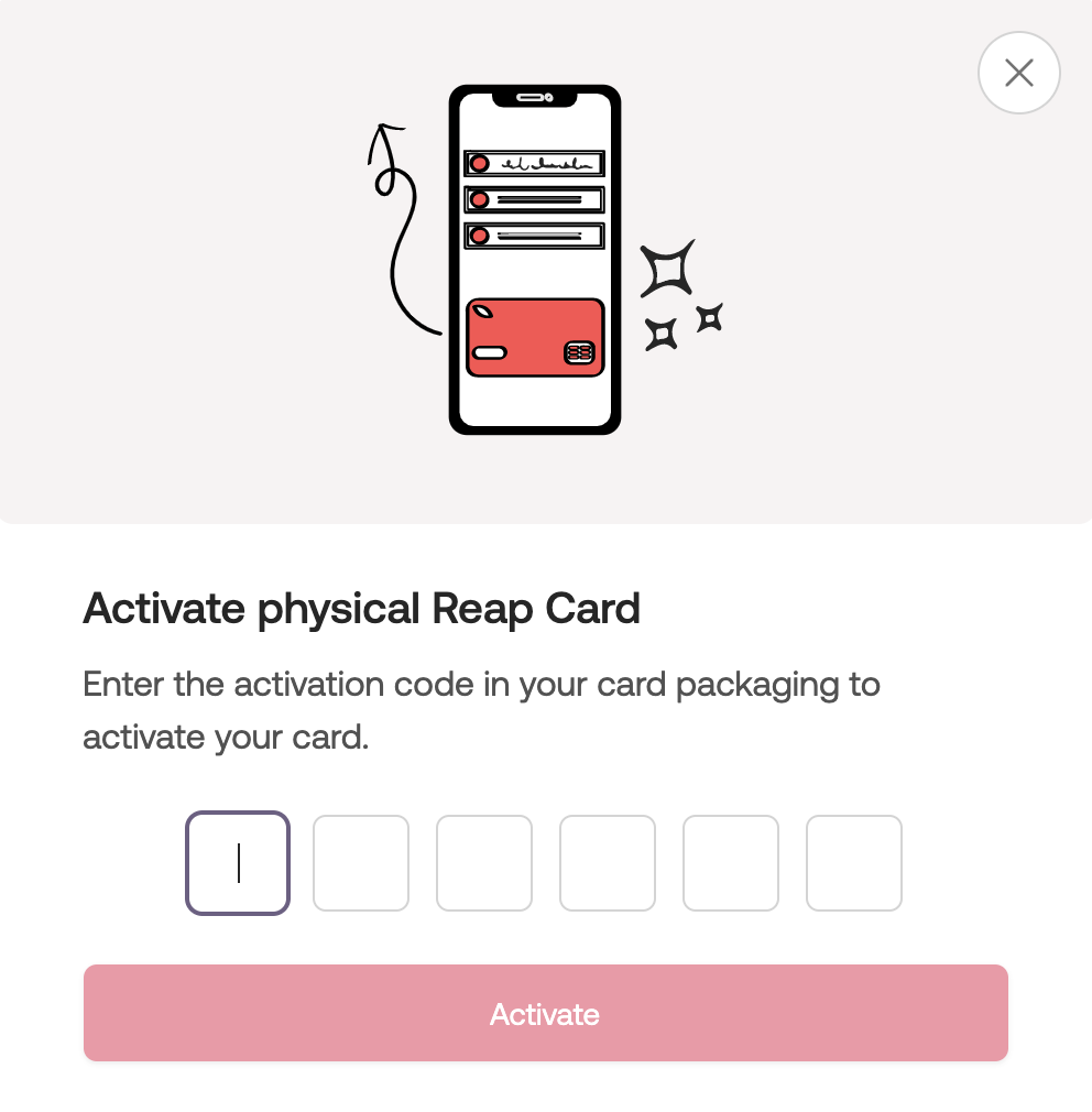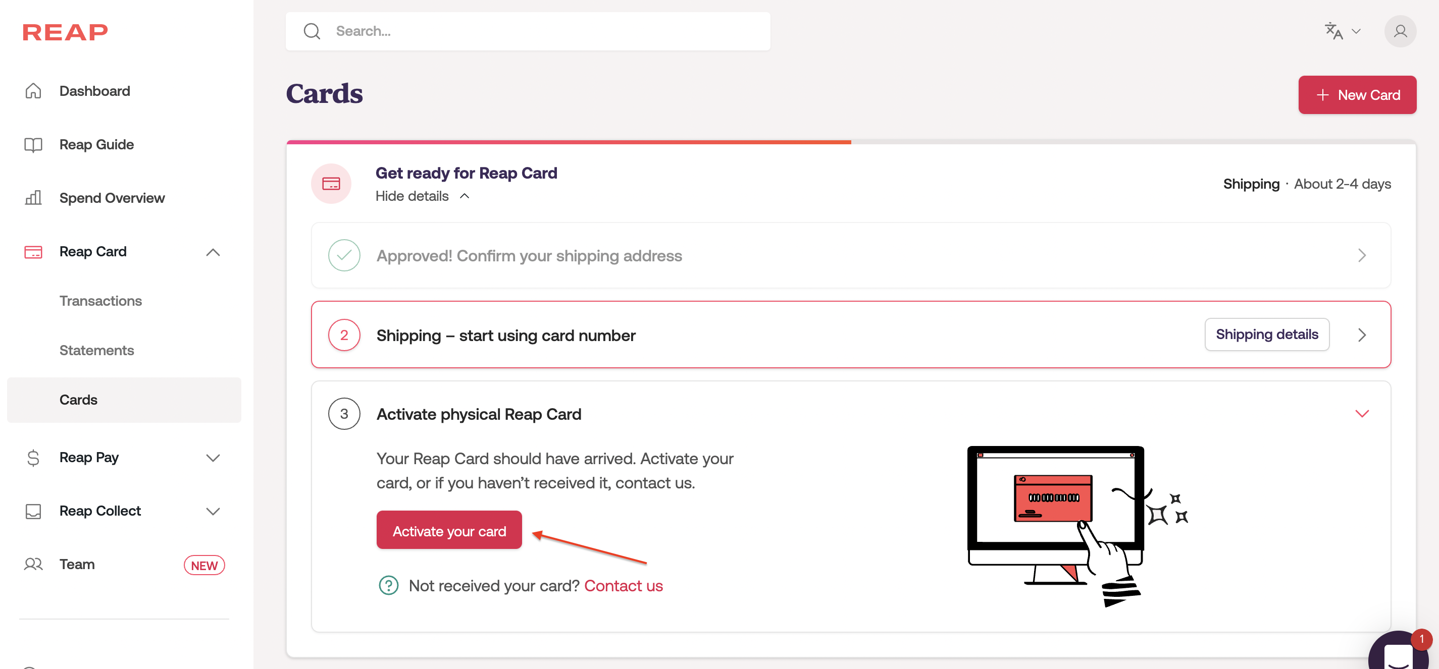 Step 1: After logging into Reap dashboard, expand the Reap Card menu and go to Cards page. Then click Activate your Card.