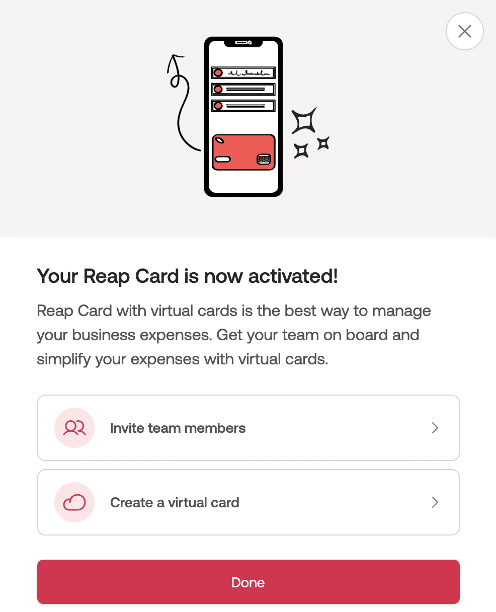 You will then see this page confirm that your physical card is activated. Feel free to Invite your team members to start using Reap or to Create a virtual card of your choice.