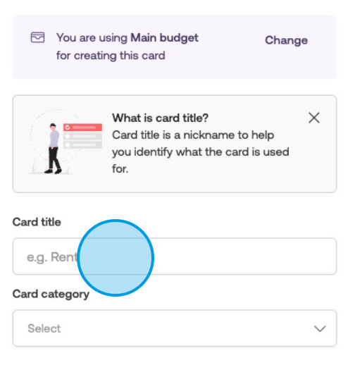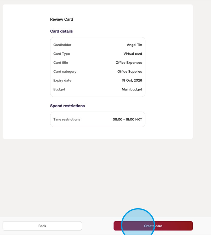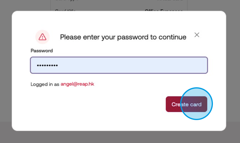 You cannot edit a card's type, category, expiry date, and budget after creation, please make sure to check it carefully.Retype the password to confirm the card creation, and click "Create card" as the final step for card creation.