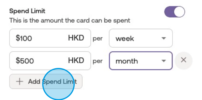 You can choose to refresh the limit on a daily, weekly, monthly, annual, and/or all-time basis based on your preference. This allows for flexible control over the card's spending capabilities within the defined limits.Choose multiple spend limits if desired.