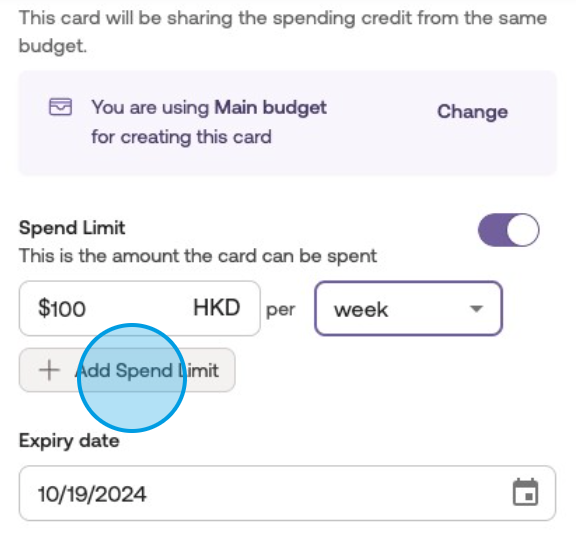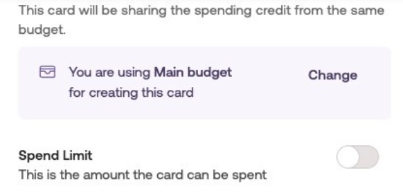 Setting up a Recurring Spend LimitToggle the spend limit option and adjust the amount and credit limit refresh frequency, to enable recurring use of the allocated spend limit.