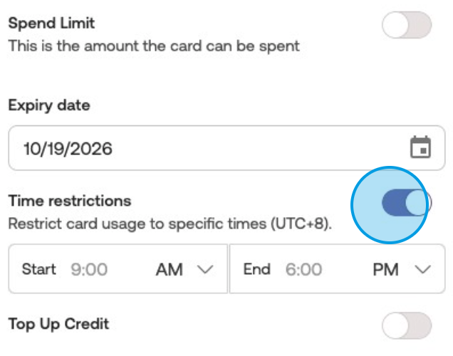 (Optional) Turn the time restrictions toggle on to limit card usage time.