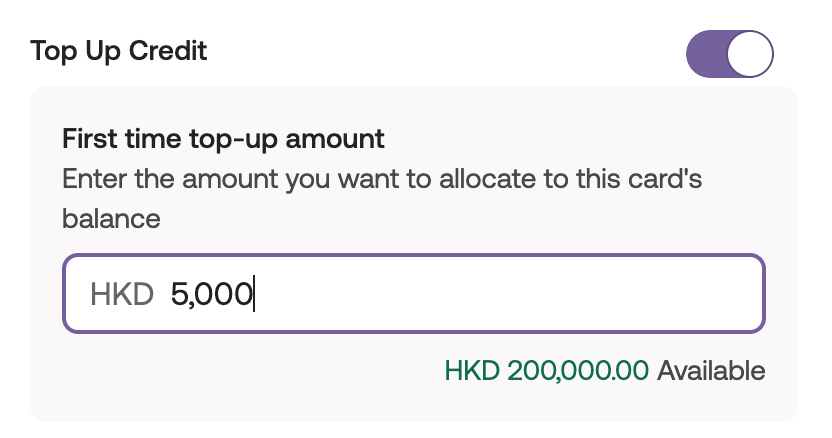 Top-up credit immediately reserves a portion of the budget for a new card. It ensures exclusive access to the designated budget, and repayments or spending remove the reservation. For example, a virtual card with a HKD 1,000 monthly fee and a HKD 5,000 top-up credit for a one-time implementation fee. Please note that an extremely high top-up may limit other cards' spending ability until the next repayment.Click "Next" to continue.