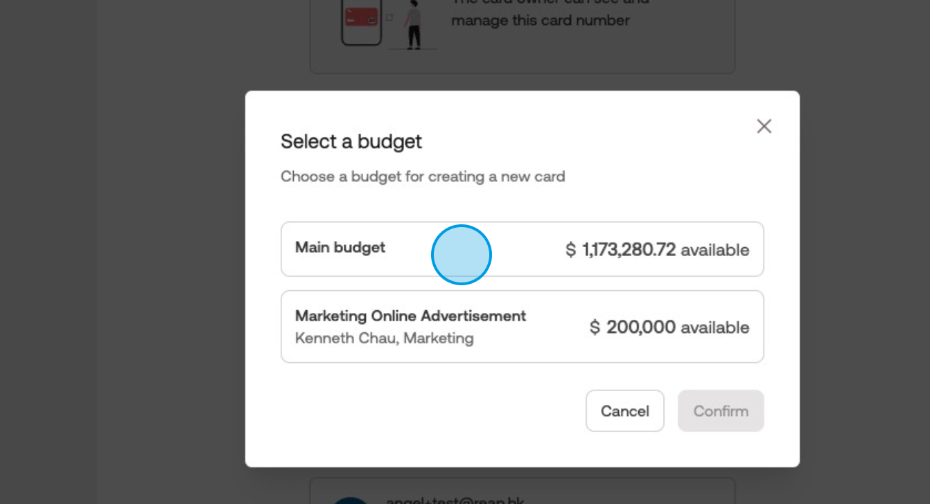 You can create budgets to separate spending into different pools. For example, within the Marketing Online Advertisement budget, you can create a Google Ads card. This enables the marketing team to set a total spending limit for all ad platform cards combined. Such budgeting facilitates efficient expense management and tracking for specific purposes.Selecting Cardholder