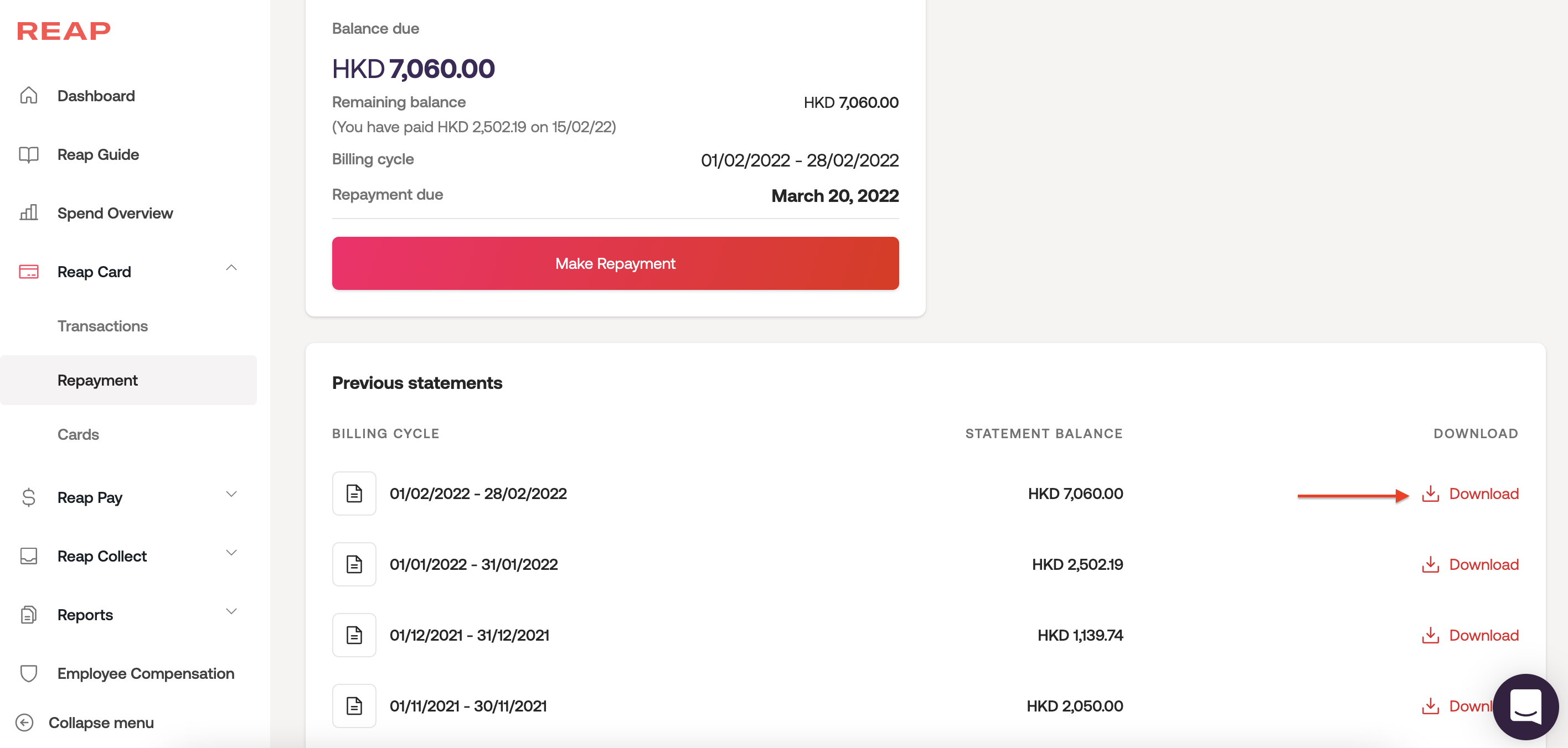 Step 2: On Repayment page, you can click on the Download button to check each month's card statement.