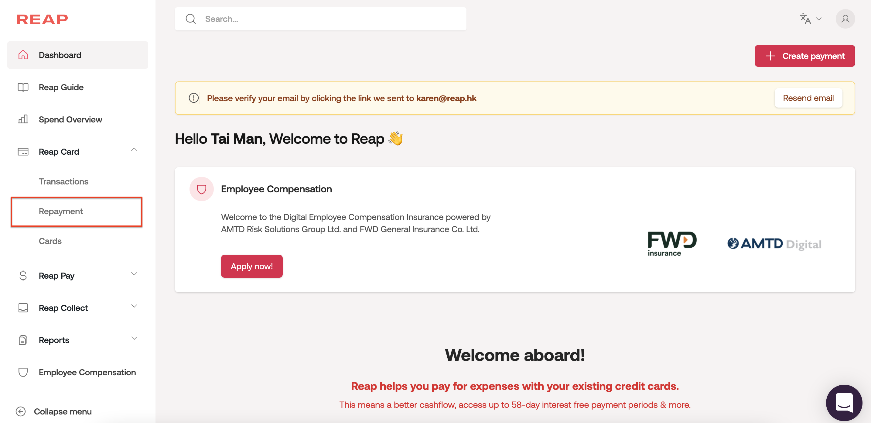 Step 1: After logging into your Reap account, expand the Reap Card menu and click Repayment.
