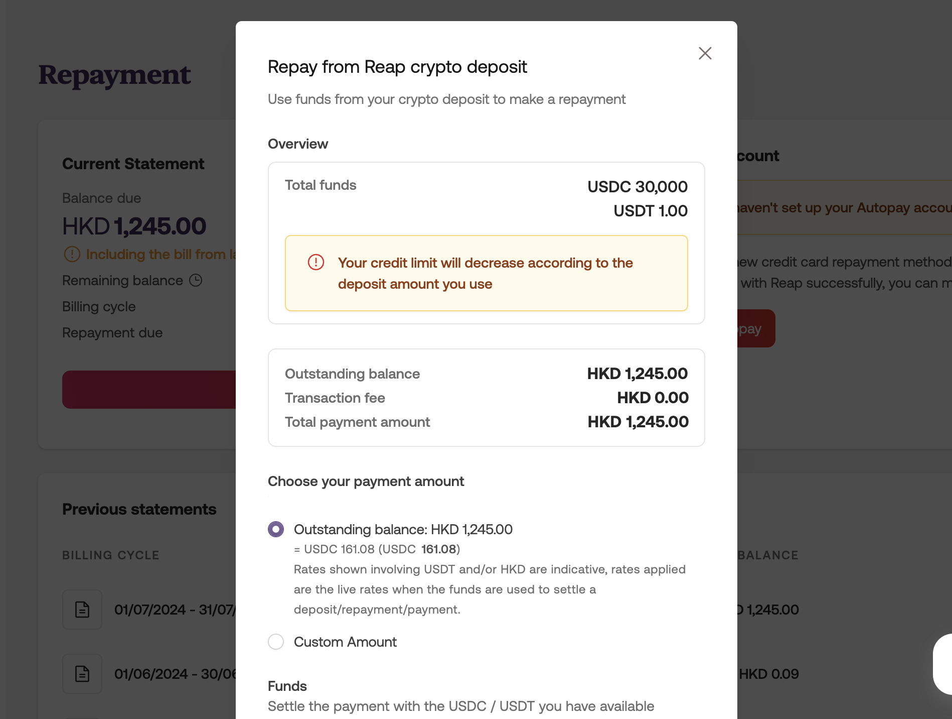 To make a repayment using your card collateral, make sure first that you have stablecoins deposited in your card collateral. You will not be able to repay your Reap Card statement using any fiat collateral, only stablecoins are supported.