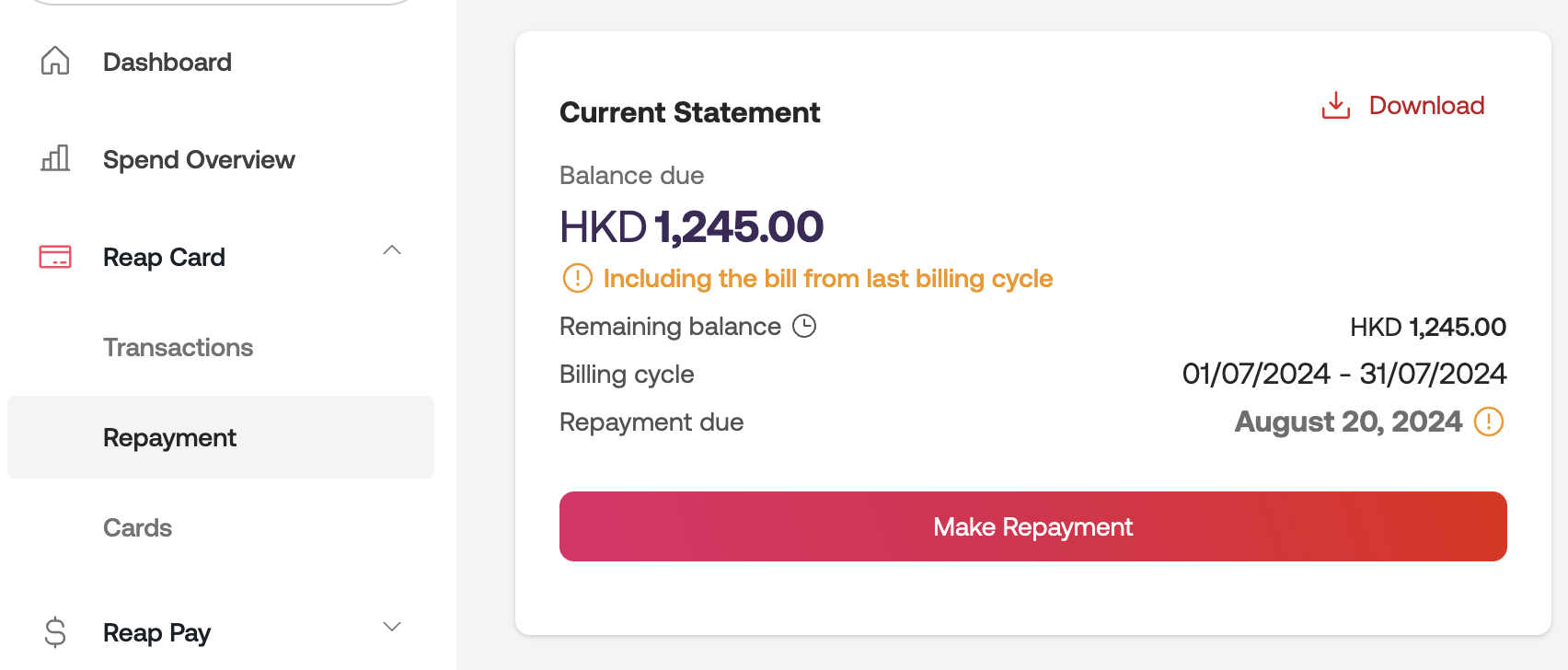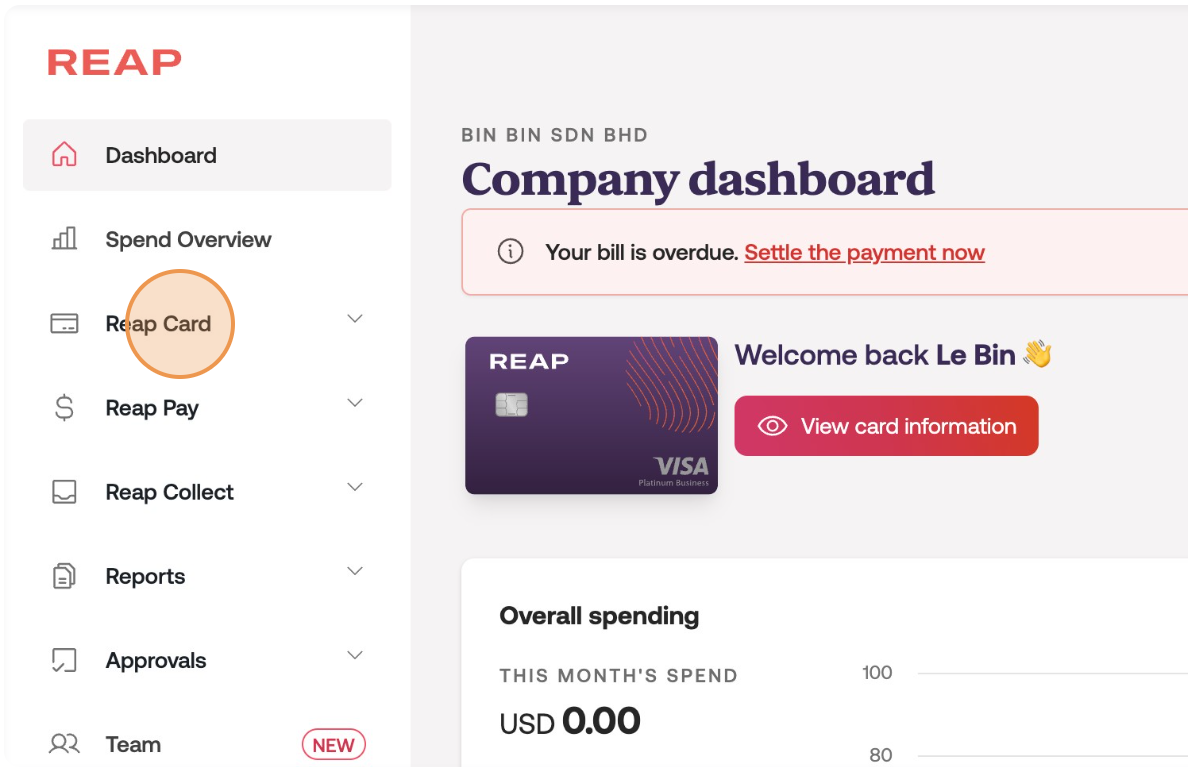 Step 1. Click on Reap Card > Repayment after logging into your Reap Dashboard.
