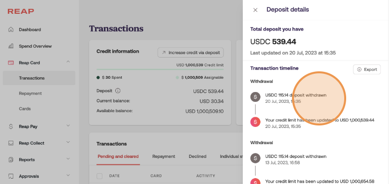 Keep in mind that using your collateral to make repayment will decrease your credit limit, i.e. company's spending power and may impact your existing cards, as some of them may have a capped credit limit. We recommend adding funds to your collateral before initiating a repayment with a deposit transaction.