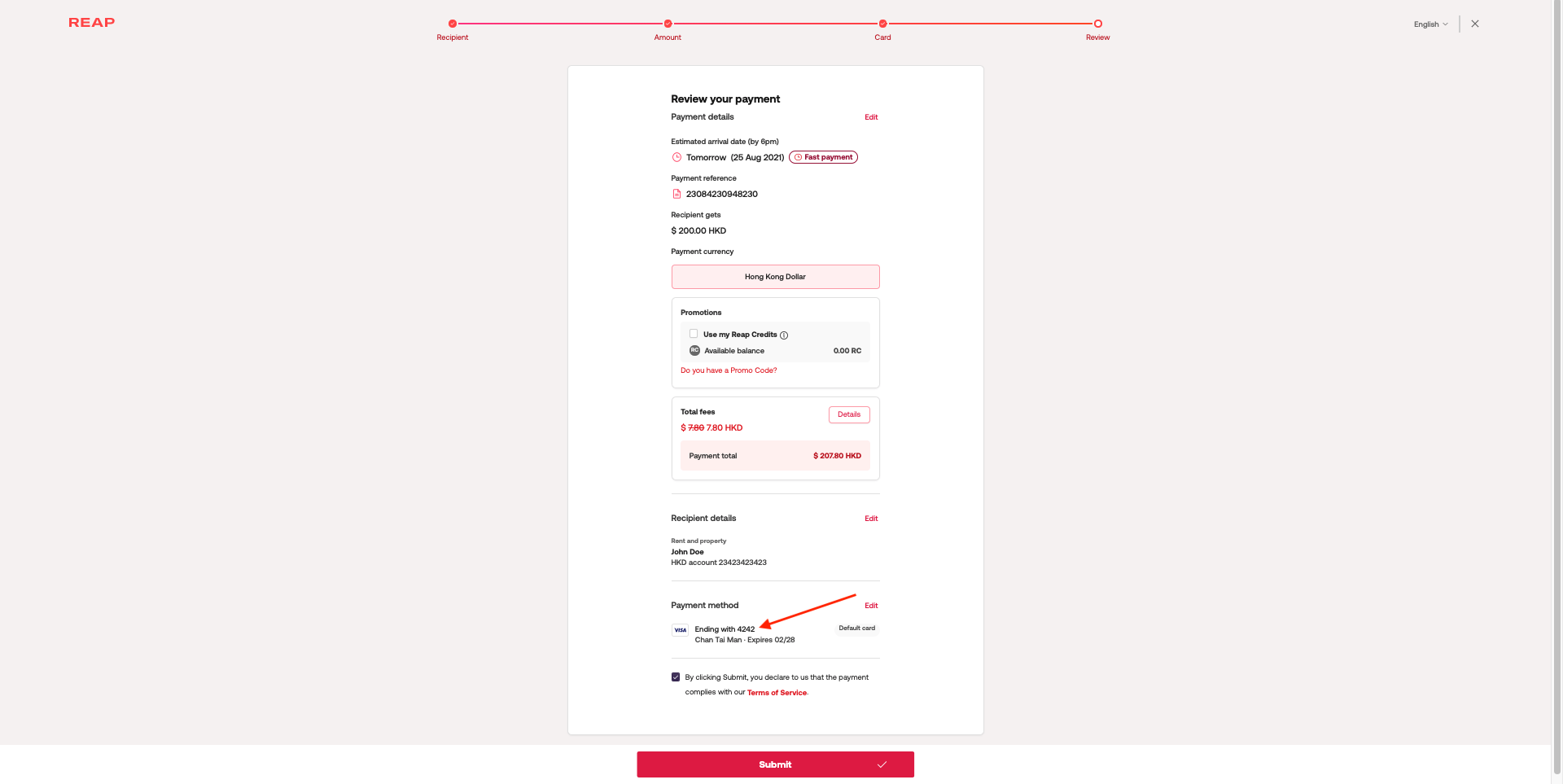 Step 3: Once you've completed the first 2 steps, you should see the corresponding Reap Card is applied on this Reap Pay transaction. After reviewing the details of the transaction, click Submit.
