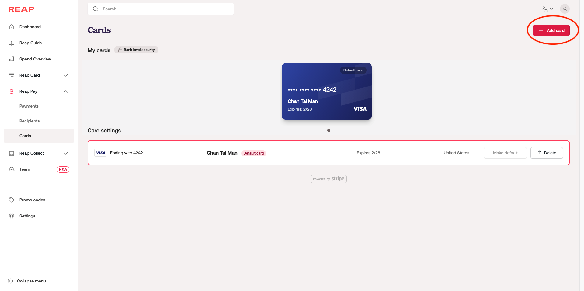 Step 1: Go to your Reap Pay dashboard and select Cards on the side bar. Then click + Add card at the top right corner of your screen.