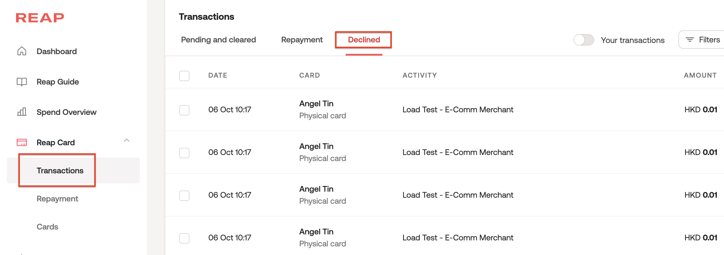 Also, you can view all declined transactions on Reap Card → Transactions → Declined tab.