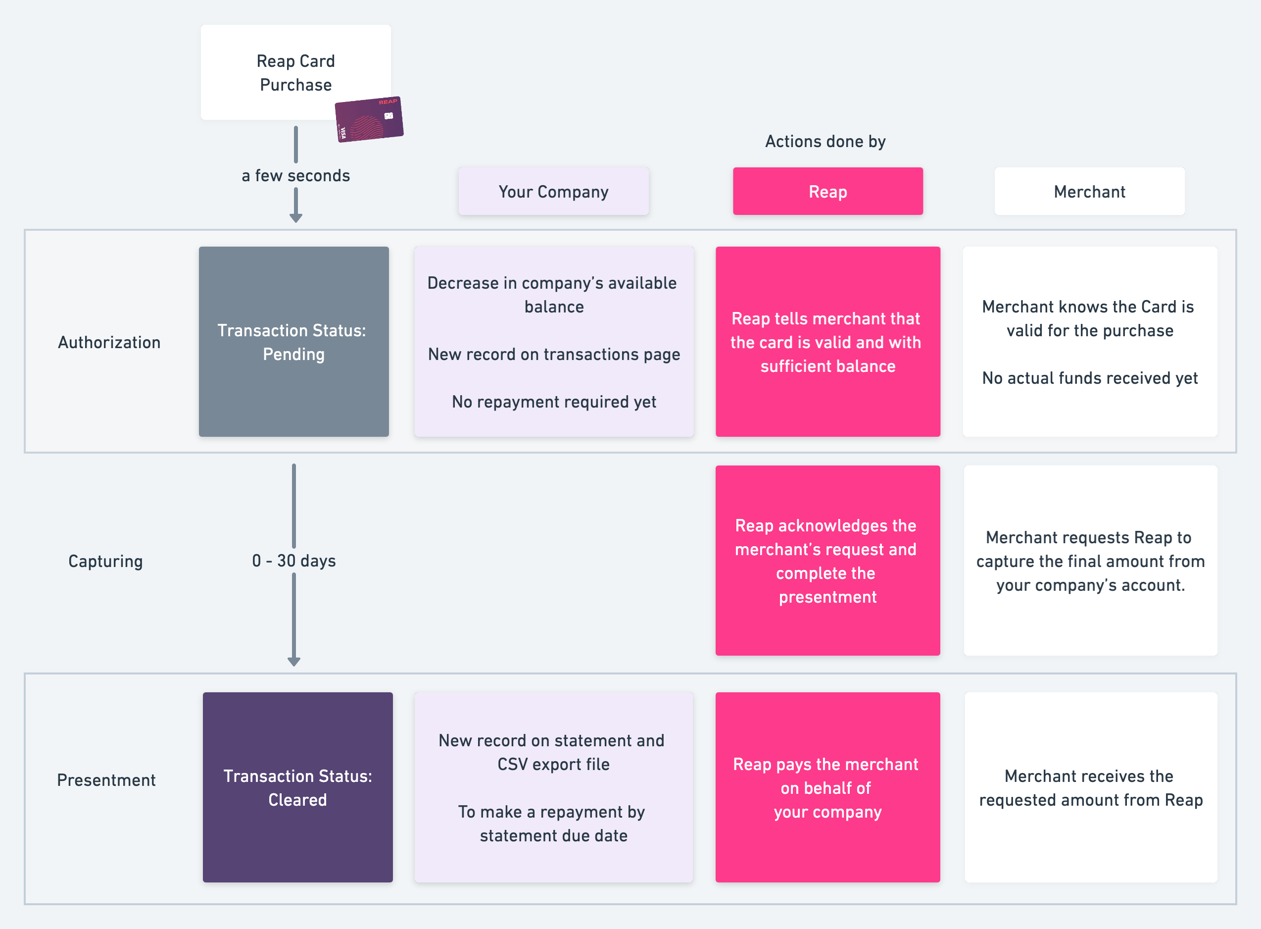 It is worth noting that it may take 0 - 30 days for the transaction status to change from Pending to Cleared. Once the transaction is Cleared, Reap will include it in the monthly statement and the cardholder's entity needs to repay the balance due by the statement due date.