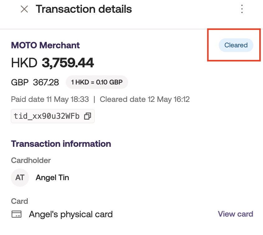 After the merchant captures the funds, Reap will mark the transaction as Cleared.