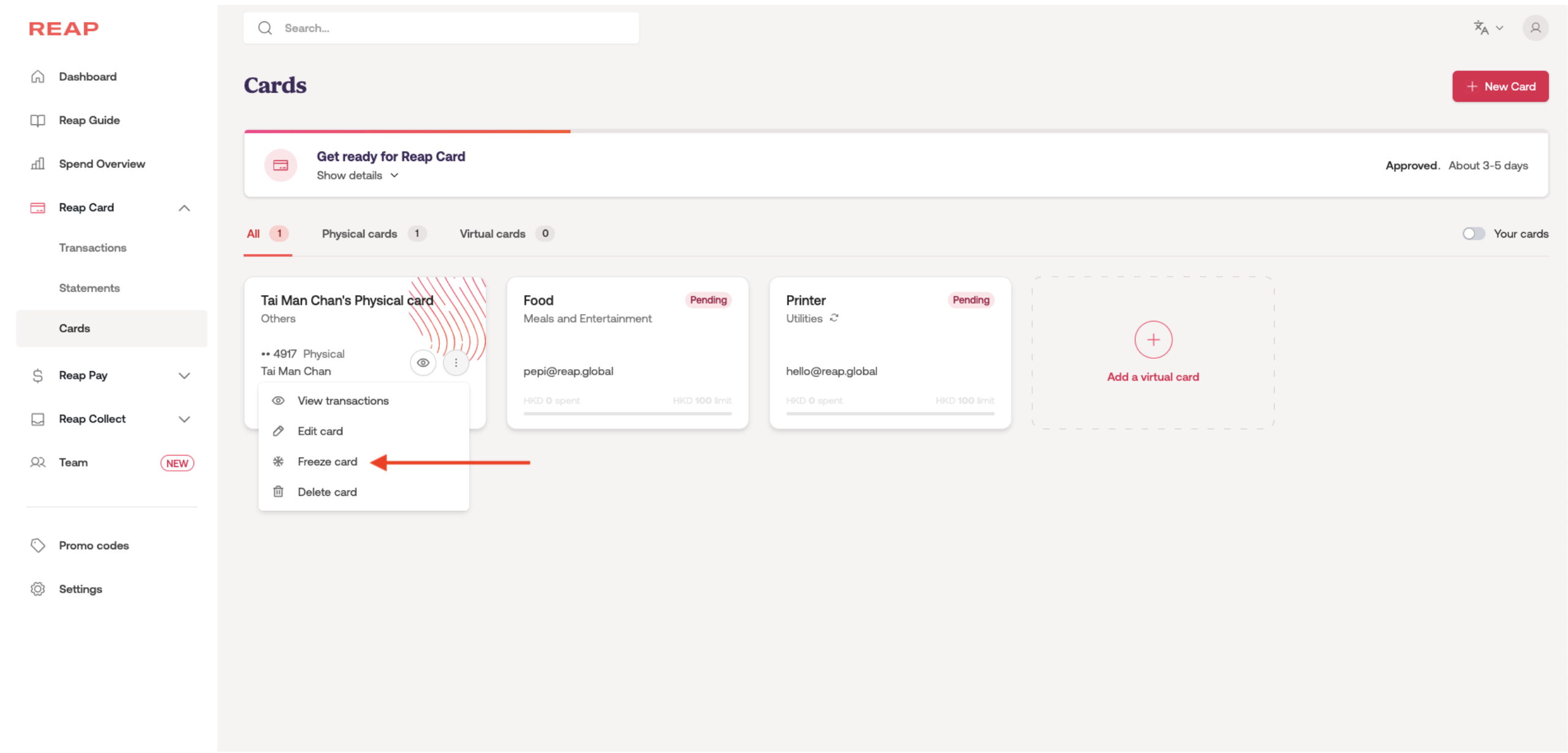 Following this guide, please log in to your Reap Dashboard and freeze your Reap Card as soon as possible.