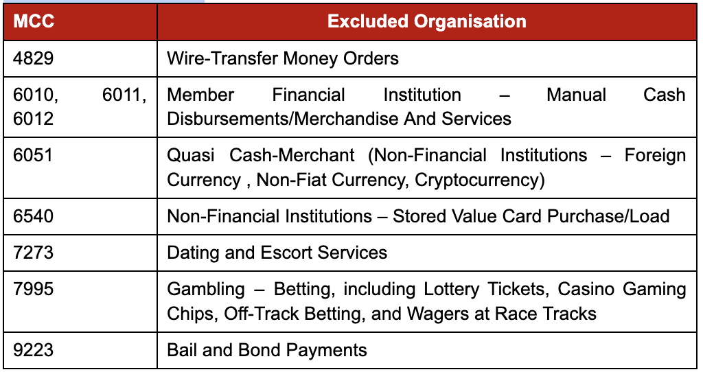 Any of the following excluded organisation as determined by the merchant category codes (MCC) from VISA: