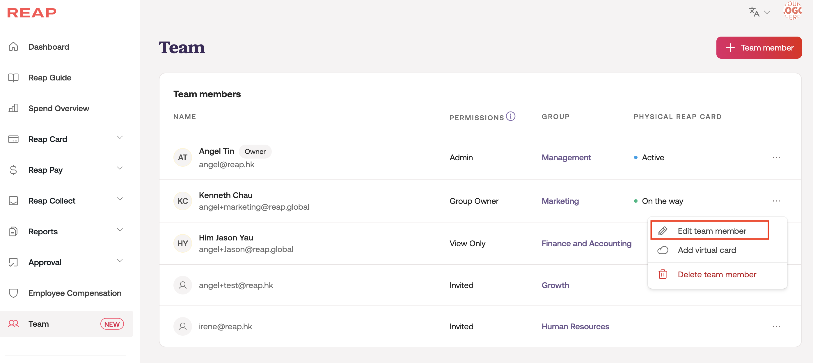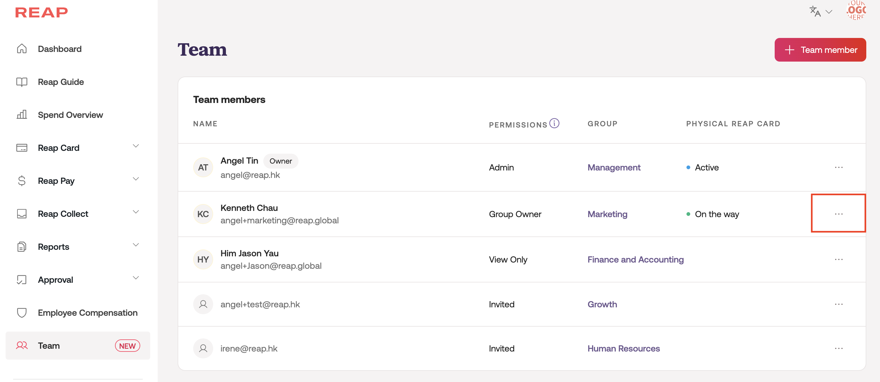 Visit Reap Dashboard → Teams page and click on the options button of the user that you want to customise his/her permissions.