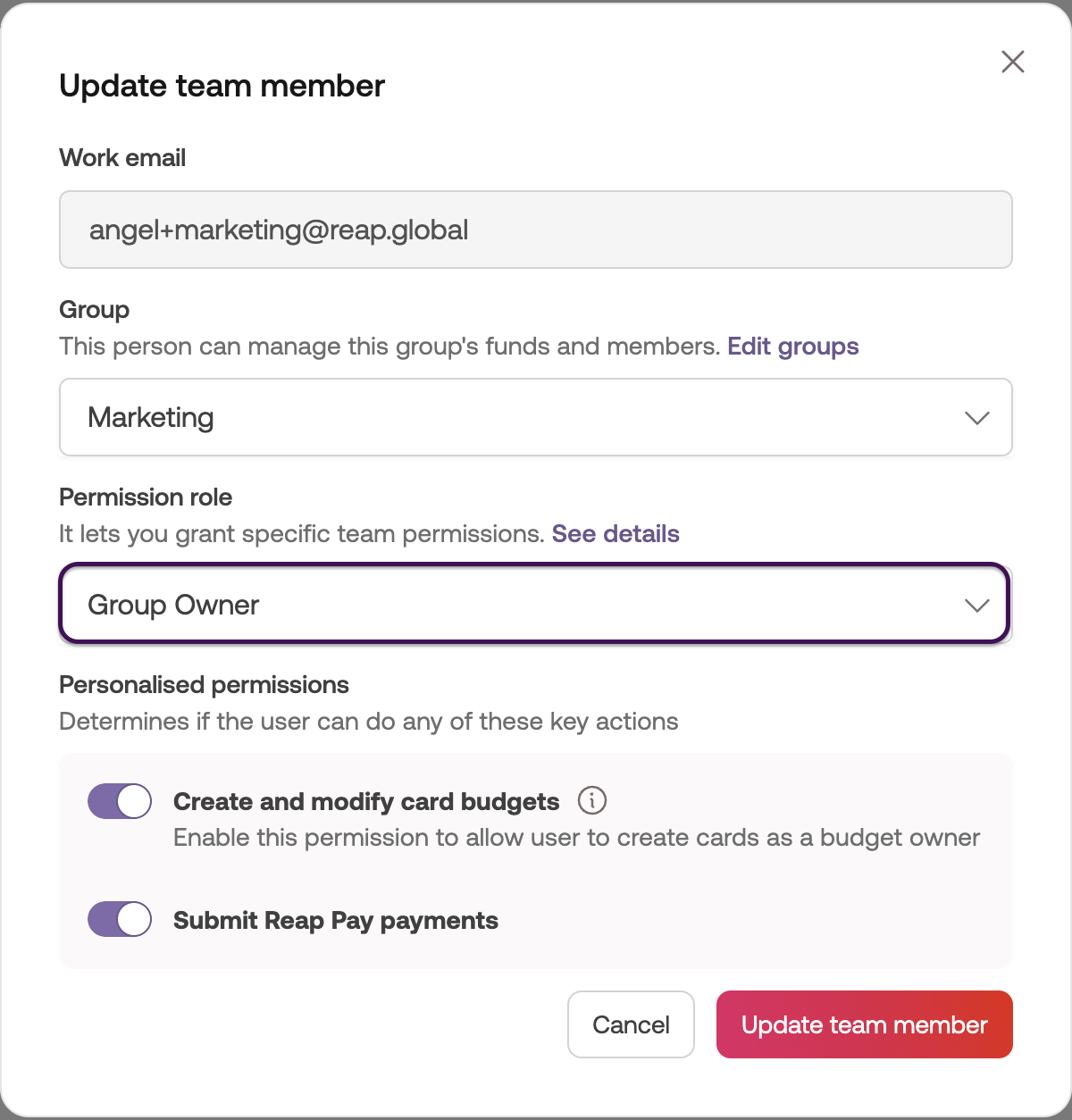 Then you'll be able to make changes to the user's permission settings, please make sure to click update team member to save the changes.