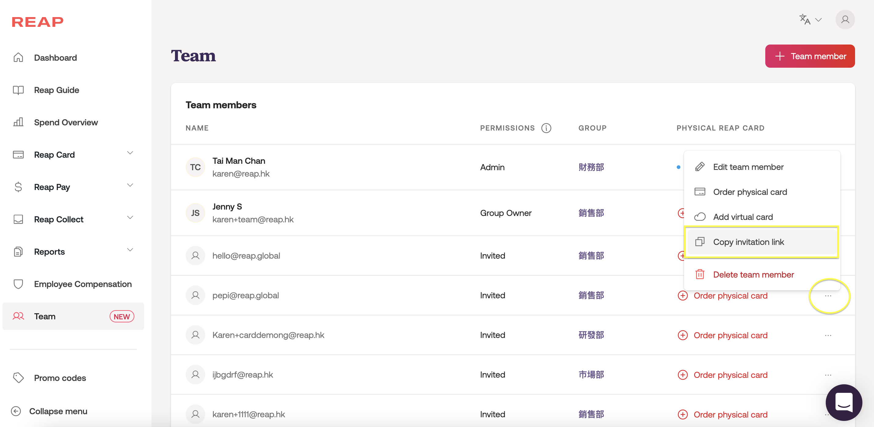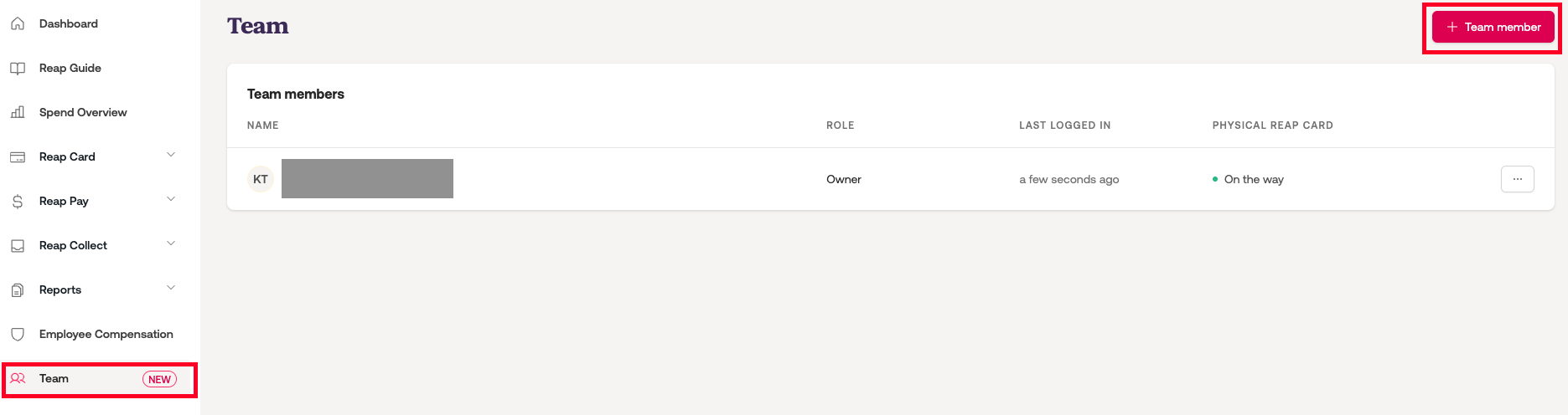 Step 1: Log in to your Reap account, and go to the Team page. Click on + Team member to start inviting a team member to use Reap