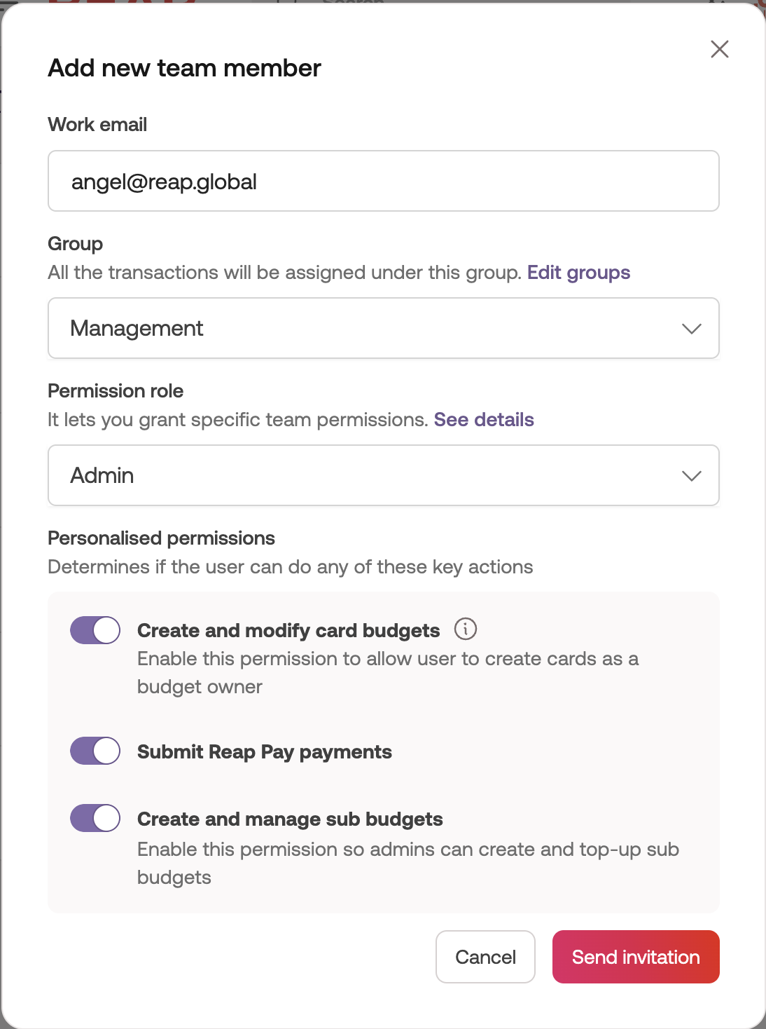 If you assign someone as an admin, you can turn the respective toggle on or off, to control the new admin's ability to create or edit cards, create new Reap Pay payments and create or manage sub budgets.