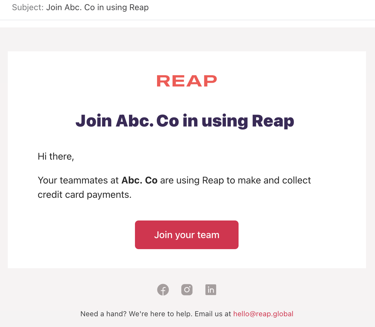 Step 3: Reap will send the invitation via email. The team member can simply click on the "Join your team" button in the email to start their registration. They can complete the registration by following the instructions here.