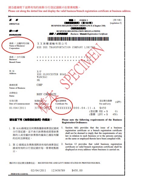 This information can be found on the Business Registration Certificate issued by the Inland Revenue Department, as shown by the red circles in the example below: