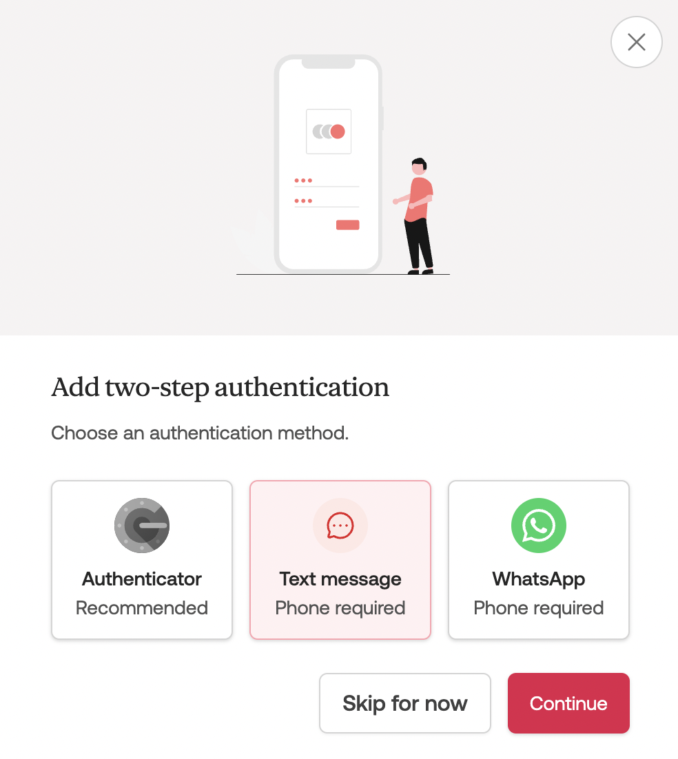 You can choose to receive the authentication code via Authenticator, Text message or WhatsApp. Pick an authentication method of your choice then click Continue.