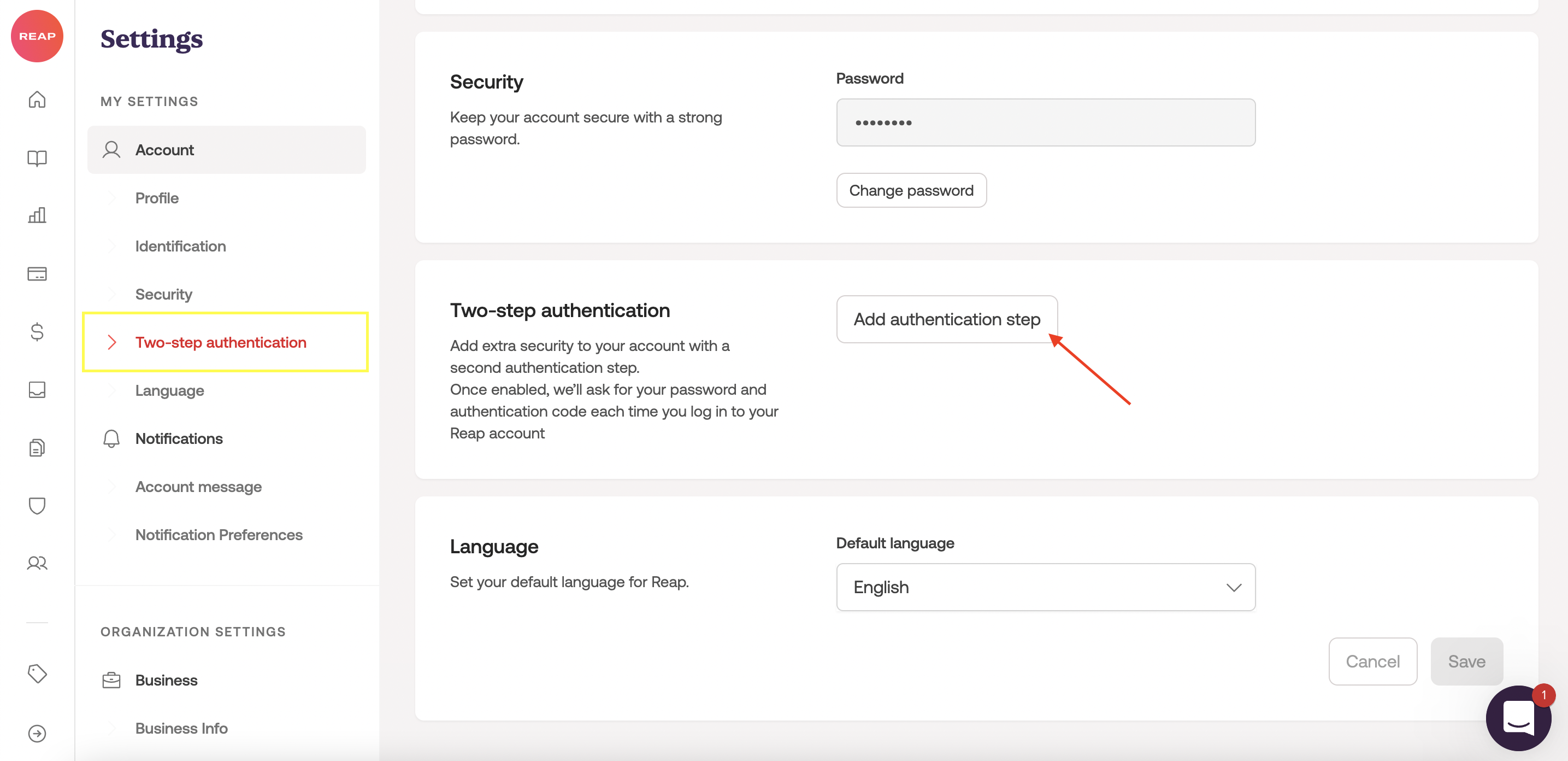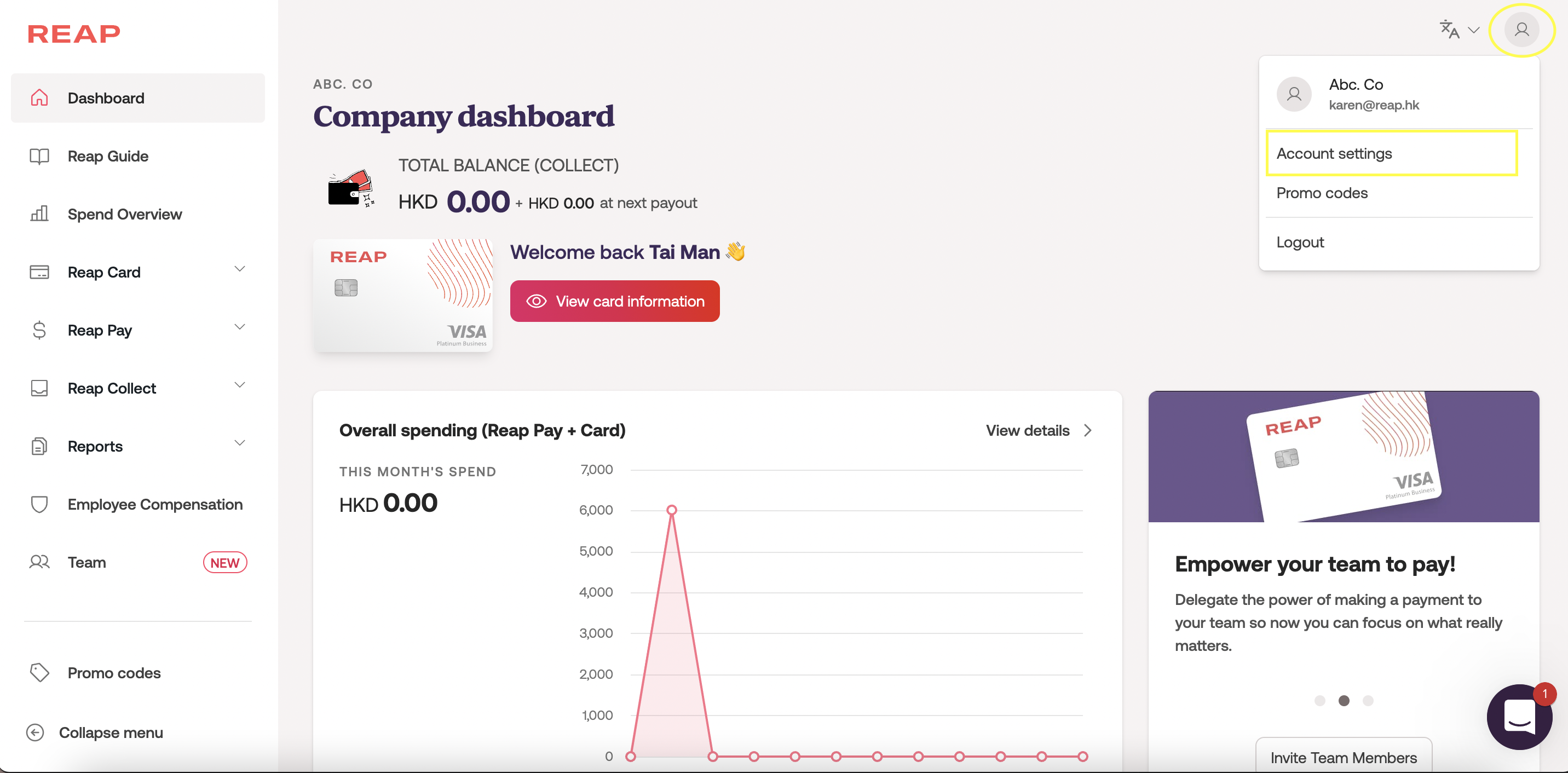 Login to Reap dashboard and click on the account icon in the upper right corner. Go to Account settings.