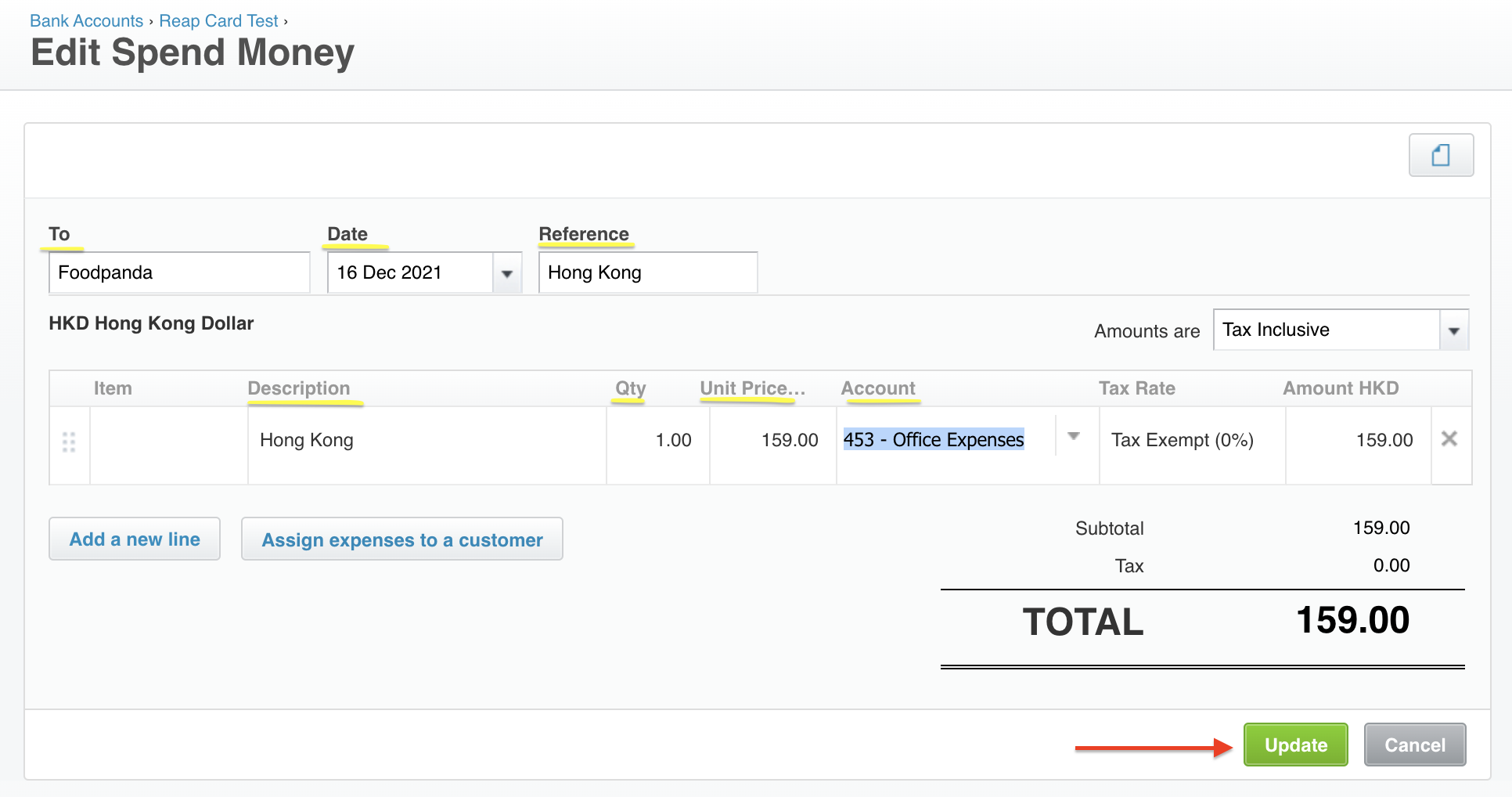 If you wish to edit the transaction details before reconciliation, click on Options -> Edit Transaction. You will be able to edit the Description, Account, Transaction Date, and more. When you finish editing, click Update to save and go back to the Account transaction page.