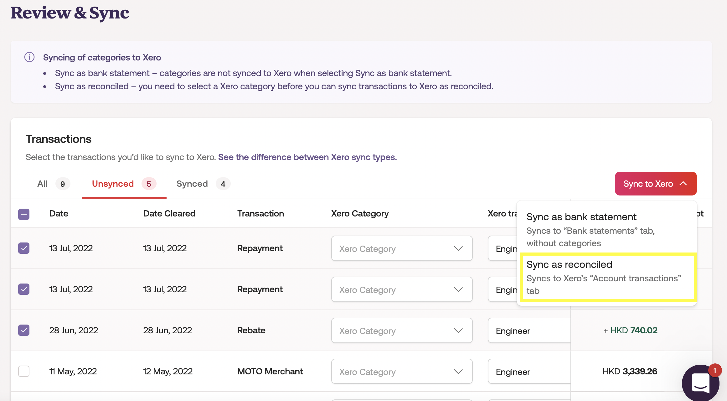 After synchronising Reap Card transactions to the accounting integrations, you might want to reconcile the data there. You can click on Sync to Integrations, then select Sync as reconciled.