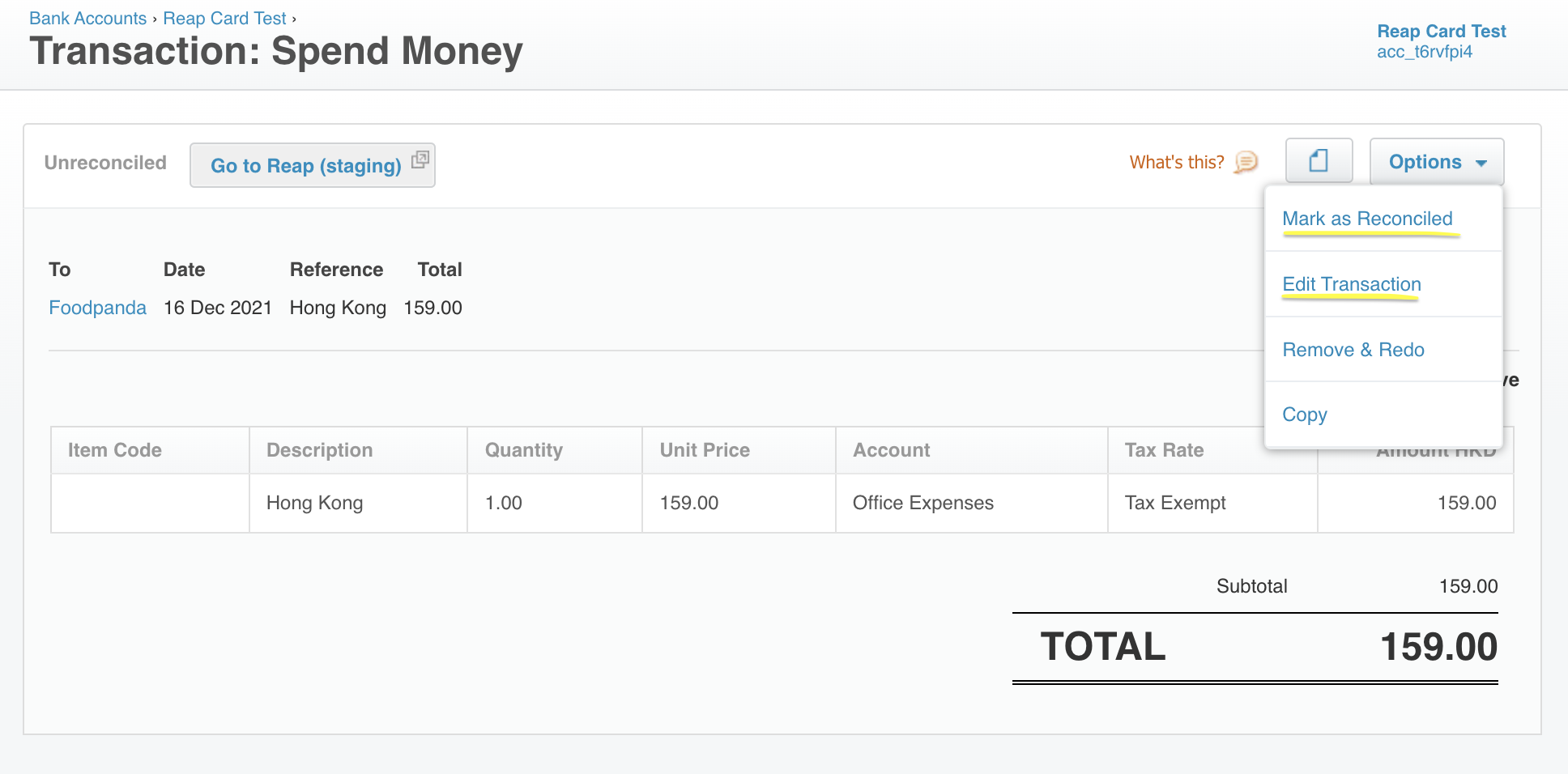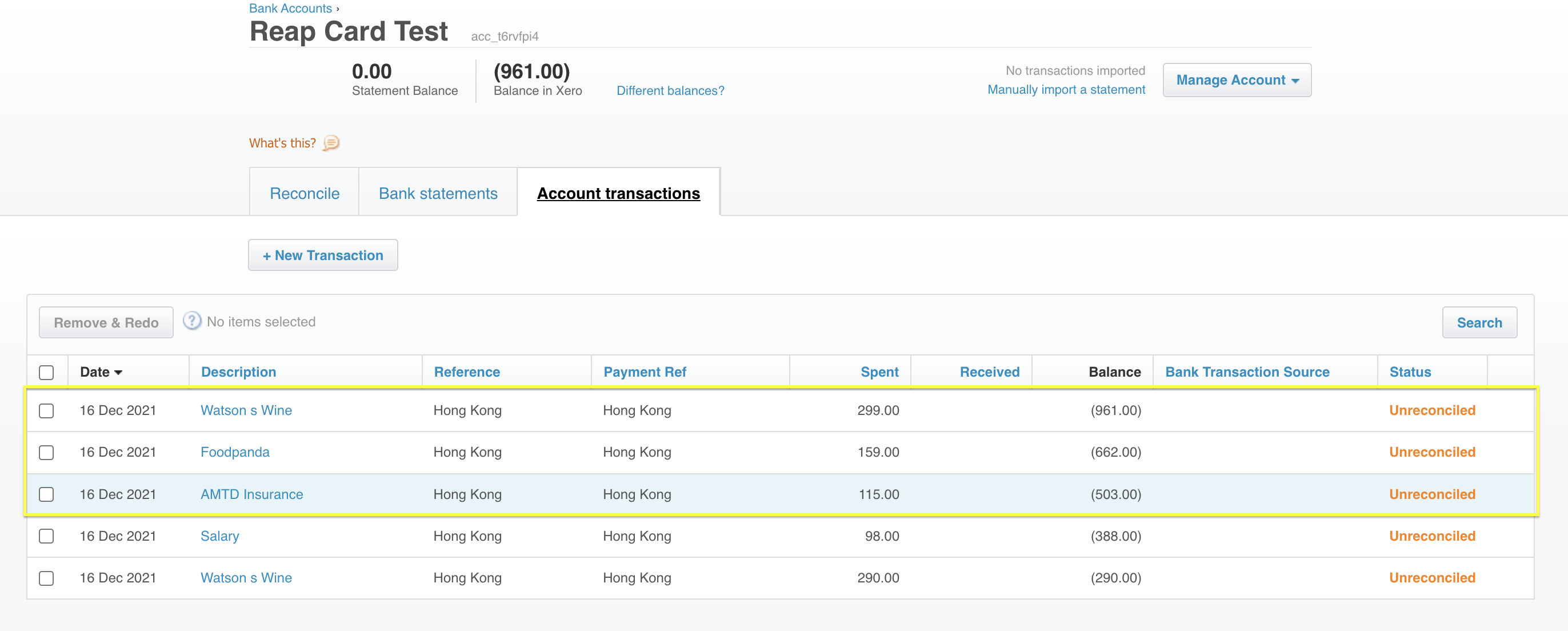 On the Account transactions tab, you will see the transactions you have synchronised from Reap dashboard showing the status Unreconciled.