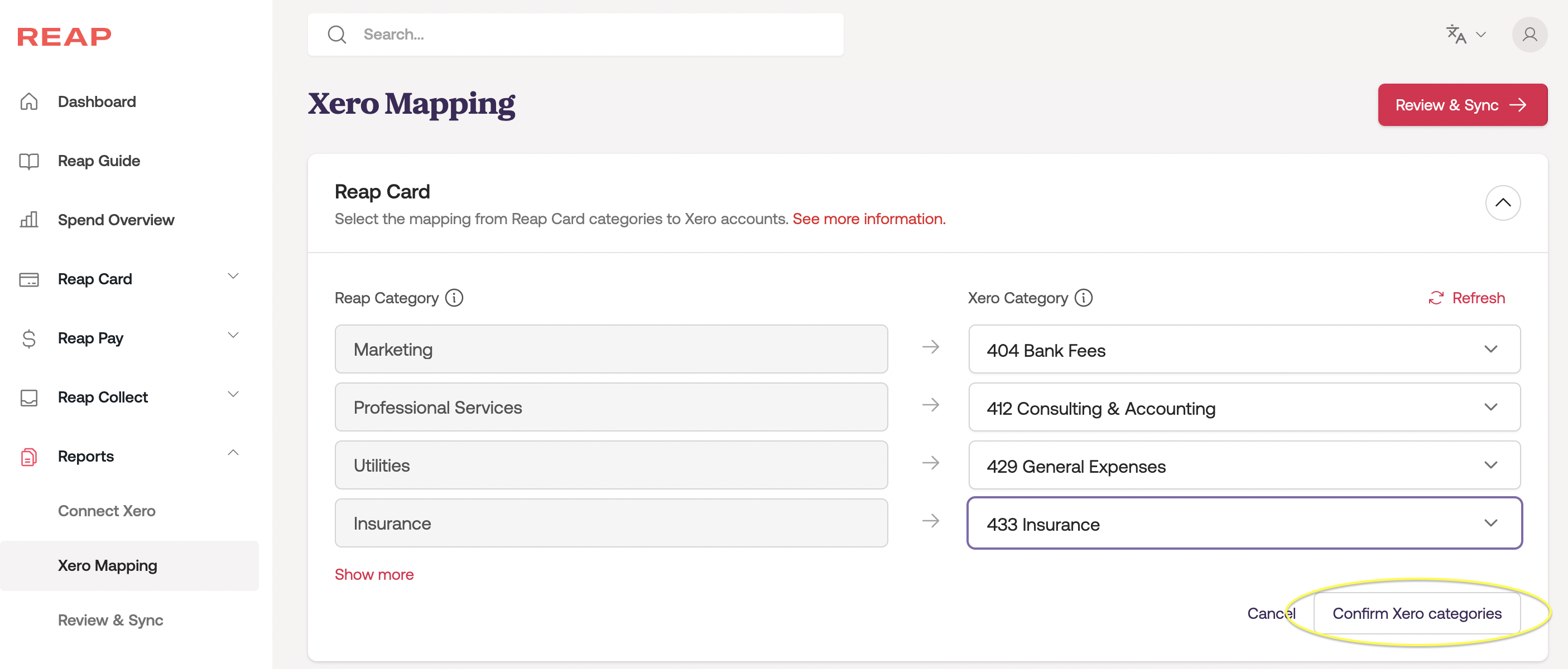 Step 2: Map Reap Card expenses categories to the respective categories. By matching the category between Reap and the accounting integrations, your Reap Card transactions will automatically categorize to the default category you have set up here.