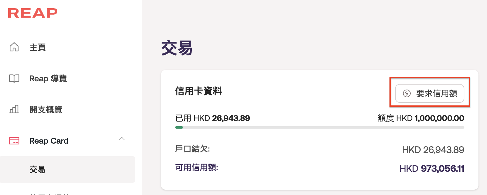 登入 Reap Dashboard → 點選 Reap Card → 交易頁面以查看 要求信用額 按鈕