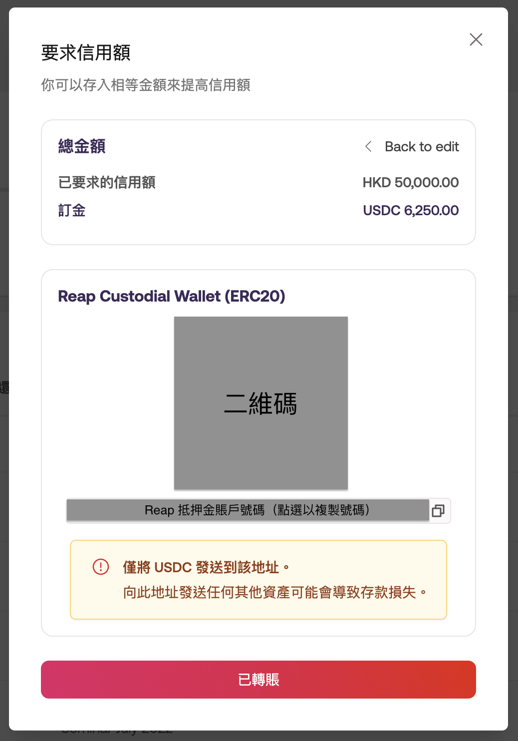 你將會看到信用額增加的詳情,以及我們的 Reap 抵押金賬戶地址。請於匯款後,點擊已轉賬按鈕通知我們。