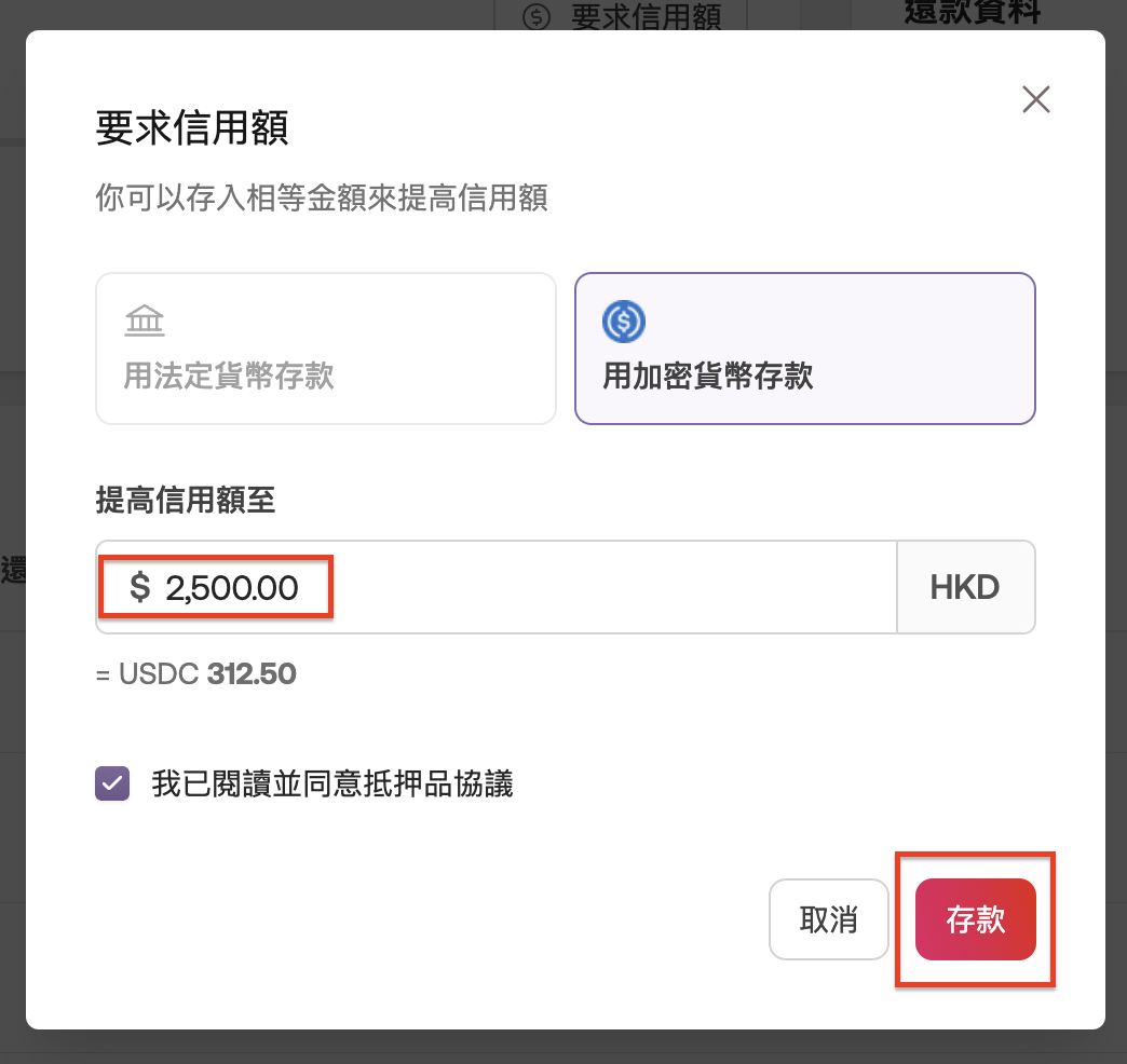 你將看到一個彈出窗口,你可以在其中輸入公司正在尋找的額外信用額度。閱讀 Reap Card 抵押品協議後,點擊複選框以同意條款,再點擊存入按鈕確認。