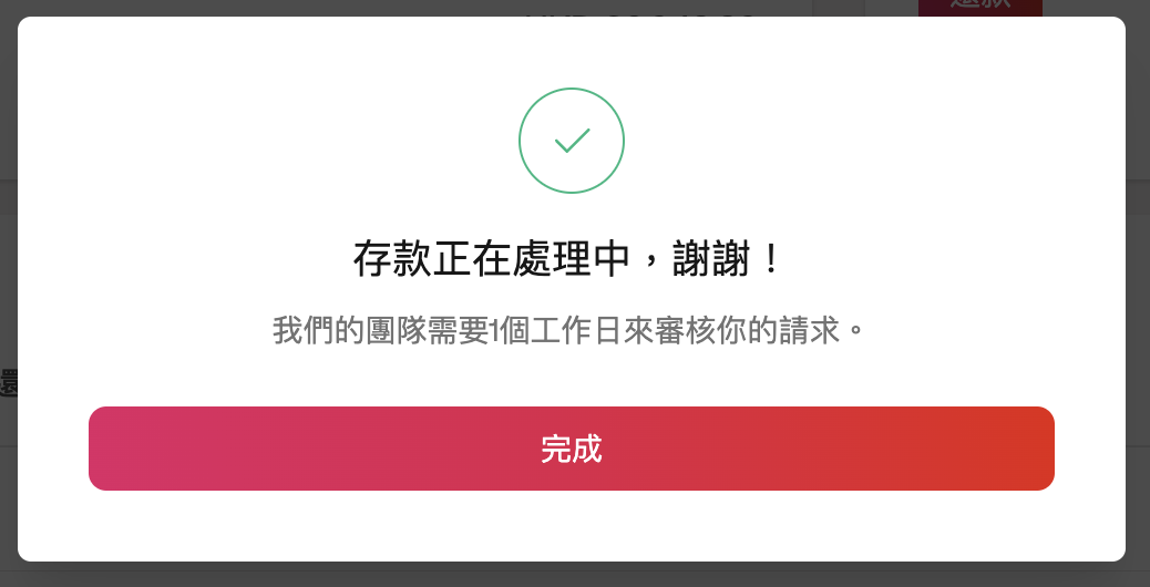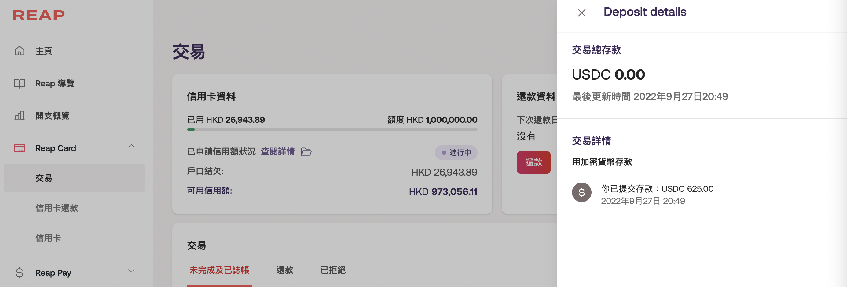 你會於 1 個工作天後看到更新後的信用額,期間你可以在 Reap dashboard 的交易頁面上跟進進度。