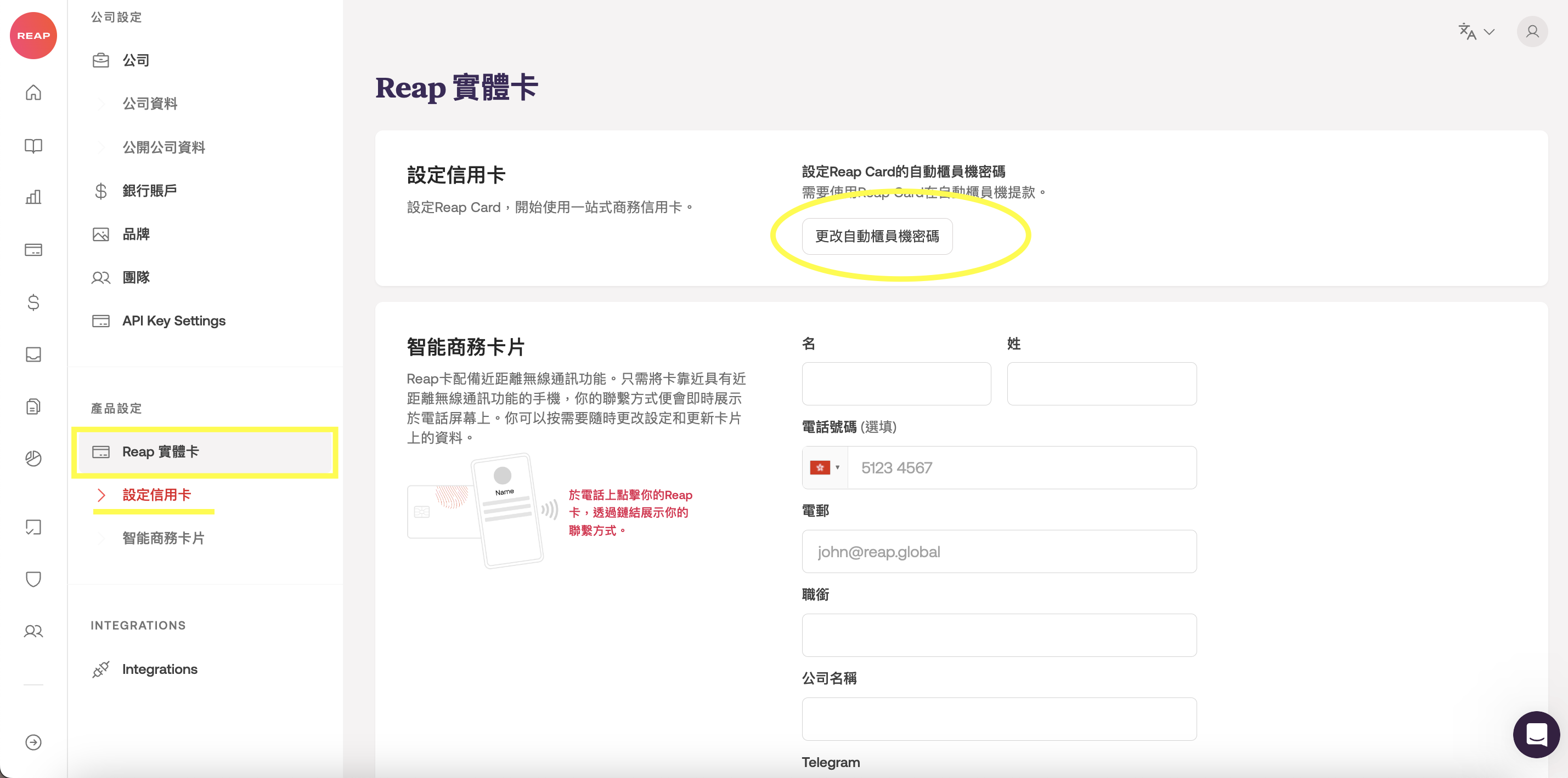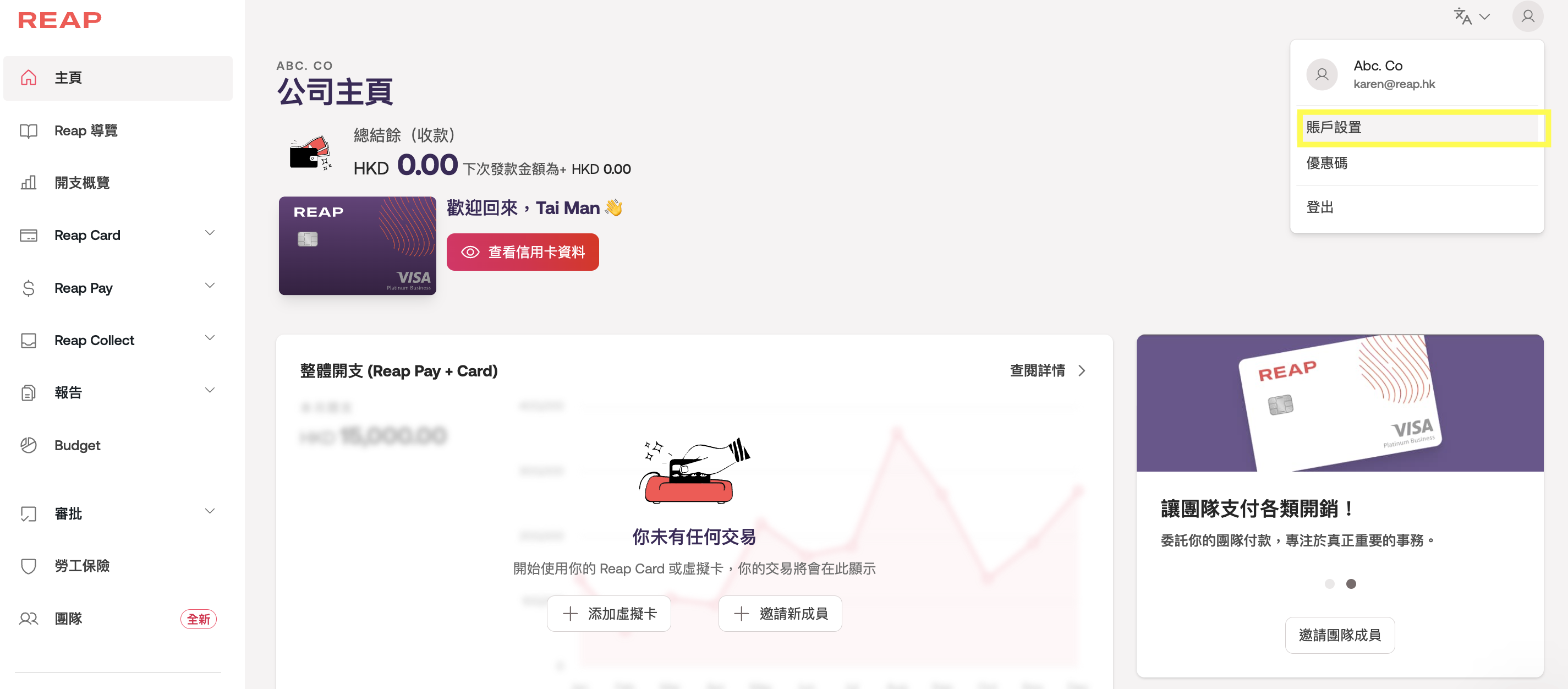 第一步:登錄Reap Dashboard後,點擊「設置」。