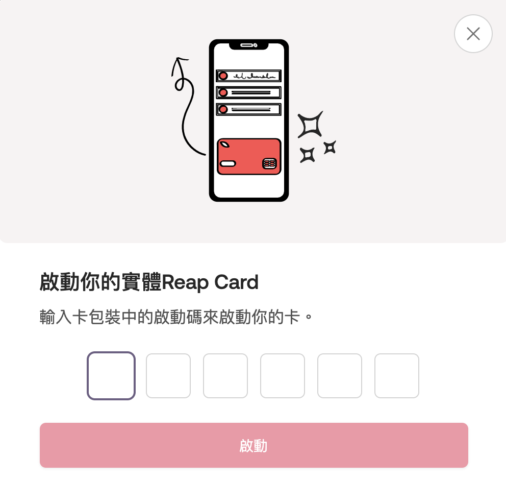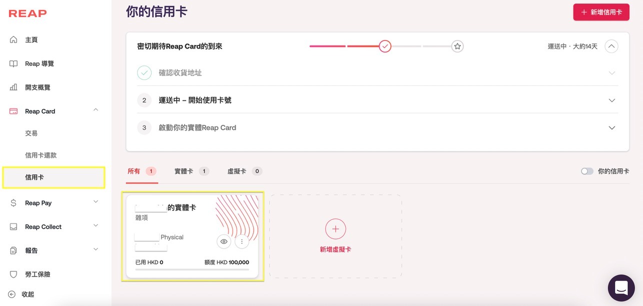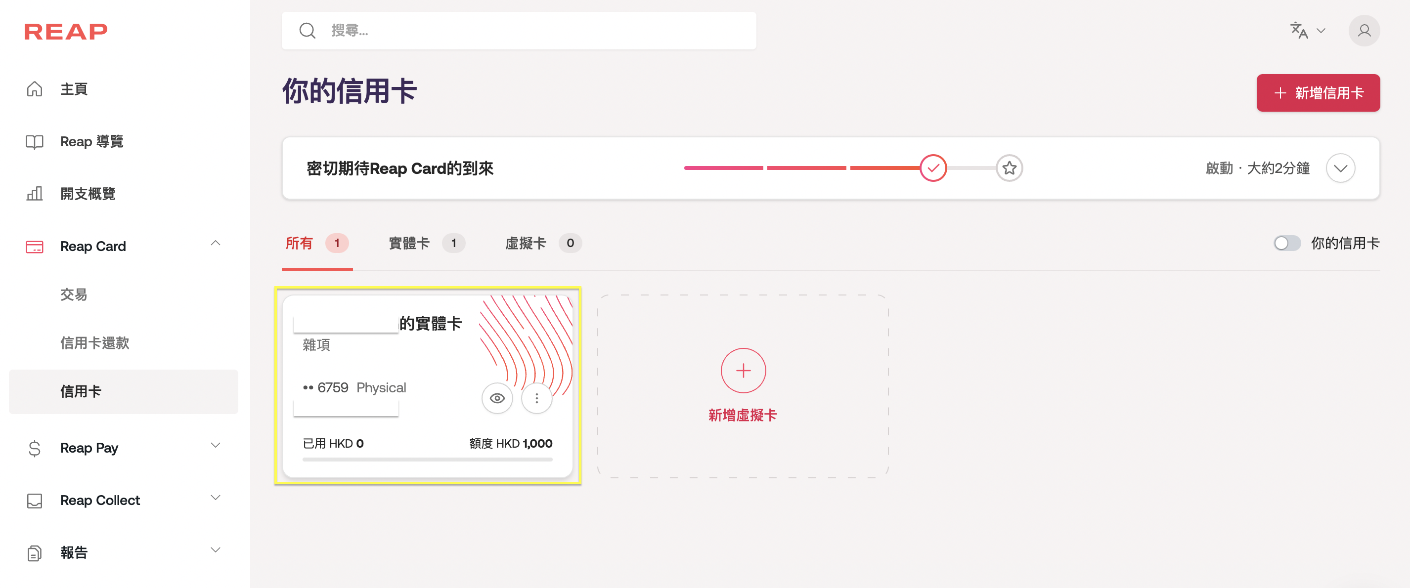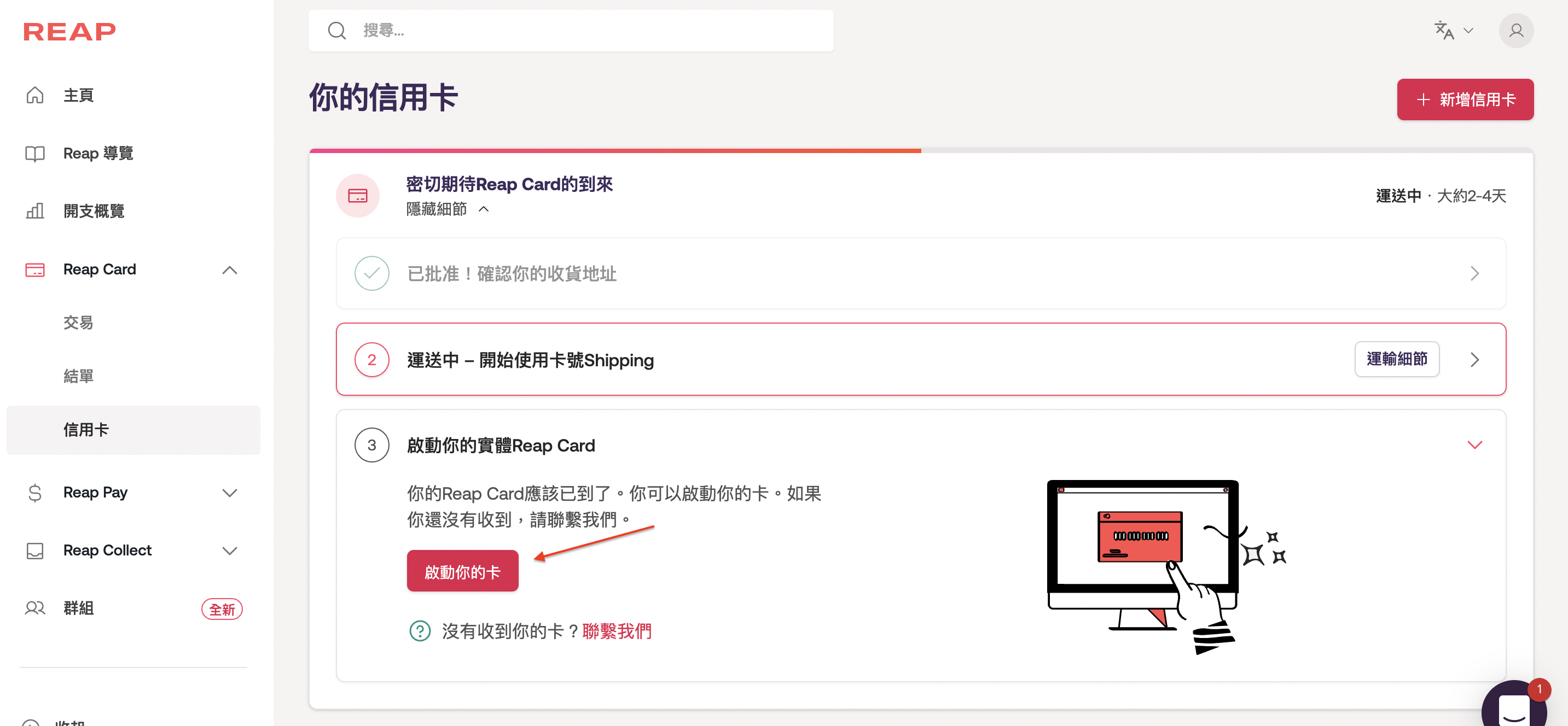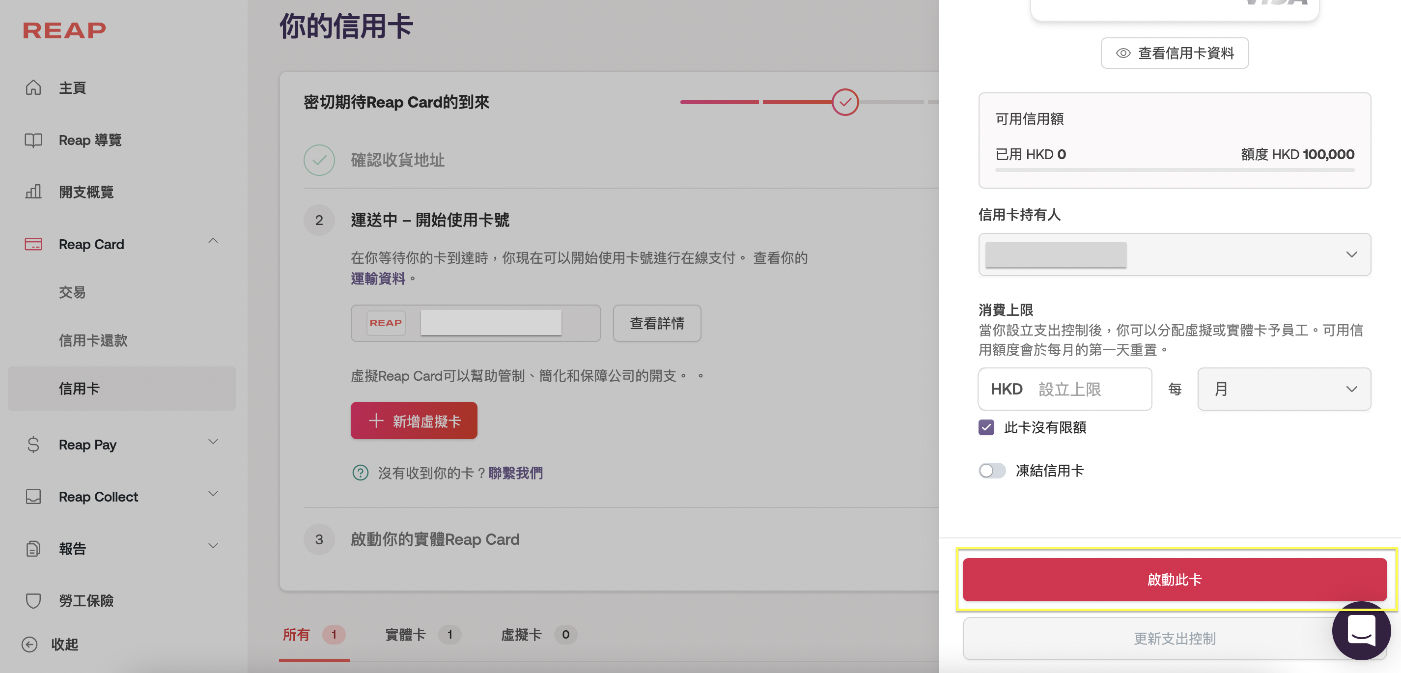 第1步:登入到你的Reap帳戶後,請打開Reap Card清單並點擊信用卡,然後在信用卡頁面按啟動你的卡按鈕
