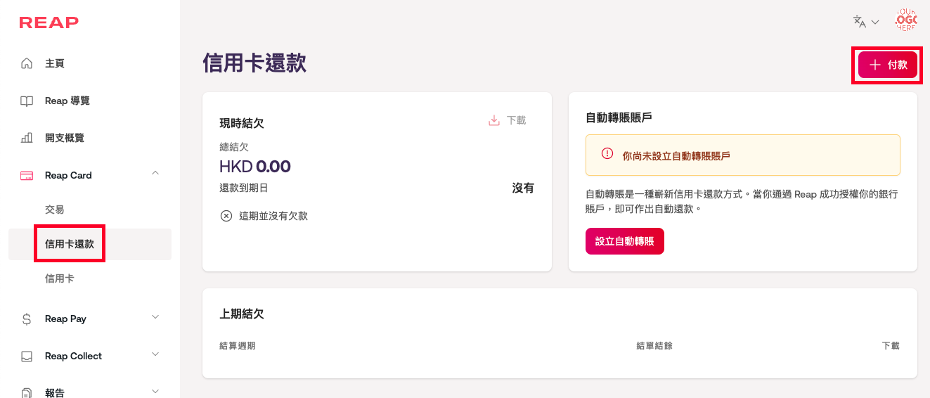 第 1 步:登入 Reap dashboard 後,進入左側邊欄中的 Reap Card → 信用卡還款頁),再點擊紅色 + 付款 按鈕。