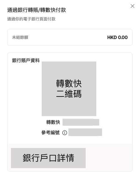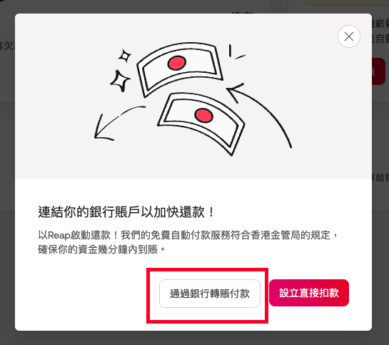 如果您使用香港的FPS(快速支付系統)或CHATS(結算所自動轉賬系統)向Reap轉賬,請在 '收款人留言' 或 '備註' 欄位中填寫所提供的參考ID。您的還款應該在5分鐘內自動完成對賬,無需點擊「已轉賬」。