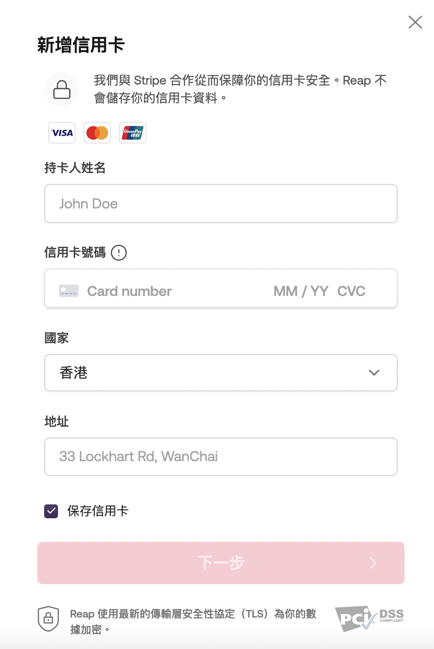 第2步:填寫你的信用卡資料(姓名、信用卡號碼、國家及地址)。如果你希望使用Reap Card作你的預設信用卡,請剔選保存信用卡。