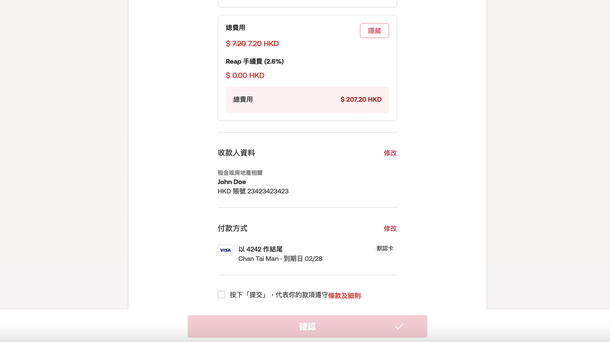 第3步:完成輸入信用卡資料後,在遞交付款的最後一步會顯示該項交易使用Reap Card付款。在覆核所有交易細節無誤後,請按確認以遞交交易。