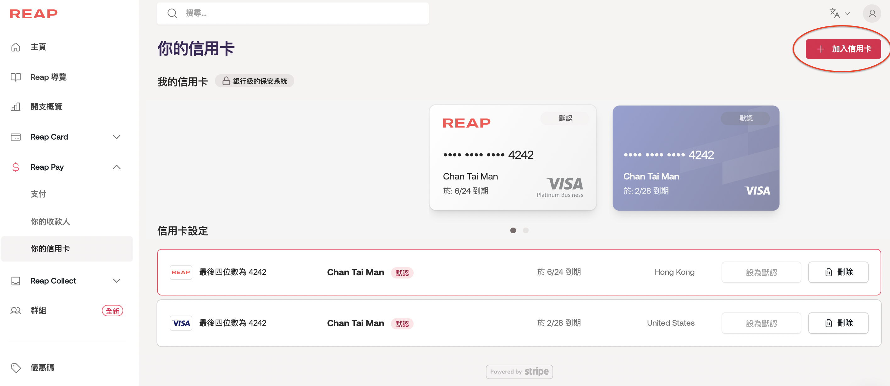 第1步:登入你的Reap帳戶,展開Reap Pay的清單然後點選你的信用卡。在你的信用卡頁面的右上角,點擊 + 加入信用卡