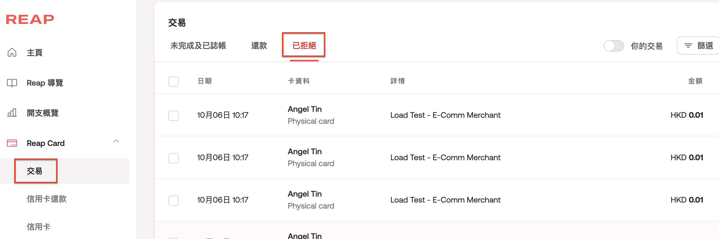 此外,你可以在 Reap Card → 交易 → 已拒絕 選項卡上查看所有拒絕的交易。